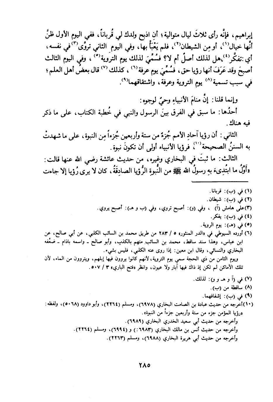 إِبْرَاهِيمَ ; فَإِنَّهُ رَأَى ثَلَاثَ لَيَالٍ مُتَوَالِيَةٍ، أَنِ اذْبَحْ وَلَدَكَ لِي قُرْبَانًا ; فَفِي الْيَوْمِ الْأَوَّلِ ظَنَّ أَنَّهَا خَيَالٌ، أَوْ مِنَ الشَّيْطَانِ، فَلَمْ يَعْبَأْ بِهَا، وَفِي الْيَوْمِ الثَّانِي تَرَوَّى فِي نَفْسِهِ، أَيْ: تَفَكَّرَ، هَلْ لِذَلِكَ أَصْلٌ أَمْ لَا؟ فَسُمِّيَ لِذَلِكَ يَوْمُ التَّرْوِيَةِ، وَفِي الْيَوْمِ الثَّالِثِ أَصْبَحَ وَقَدْ عَرَفَ أَنَّهَا رُؤْيَا حَقٌّ ; فَسُمِّيَ يَوْمَ عَرَفَةَ، كَذَلِكَ قَالَ بَعْضُ أَهْلِ الْعِلْمِ، فِي سَبَبِ تَسْمِيَةِ يَوْمِ التَّرْوِيَةِ وَعَرَفَةَ، وَاشْتِقَاقِهِمَا.
