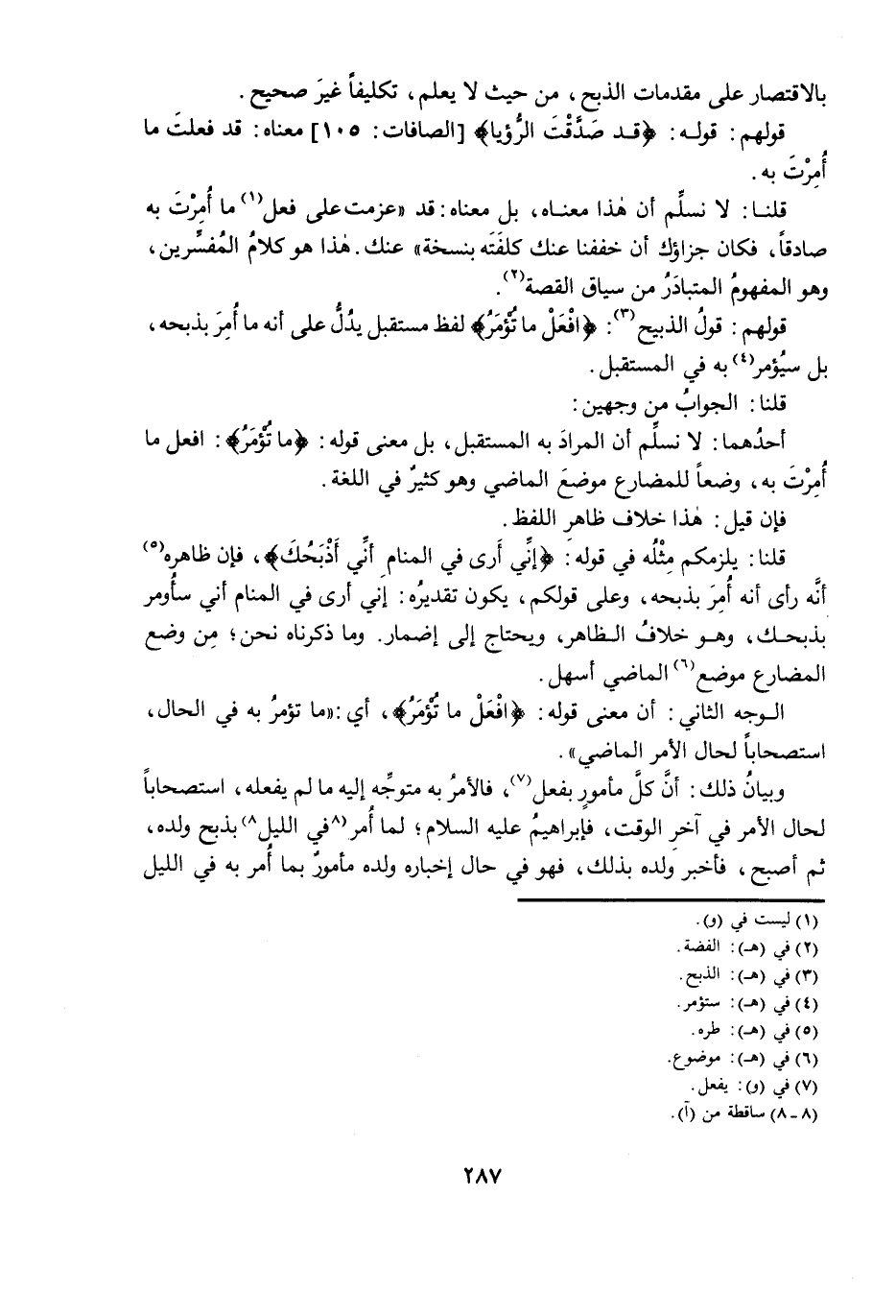 قَوْلُهُمْ: قَوْلُ الذَّبِيحِ: افْعَلْ مَا تُؤْمَرُ، لَفْظٌ مُسْتَقْبَلٌ يَدُلُّ عَلَى أَنَّهُ مَا أُمِرَ بِذَبْحِهِ، بَلْ سَيُؤْمَرُ بِهِ فِي الْمُسْتَقْبَلِ.
