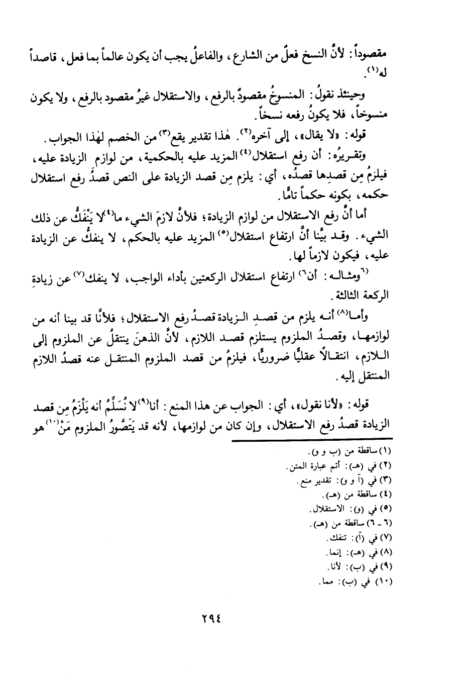 وَحِينَئِذٍ نَقُولُ: الْمَنْسُوخُ مَقْصُودٌ بِالرَّفْعِ، وَالِاسْتِقْلَالُ غَيْرُ مَقْصُودٍ بِالرَّفْعِ، وَلَا يَكُونُ مَنْسُوخًا ; فَلَا يَكُونُ رَفْعُهُ نَسْخًا.
