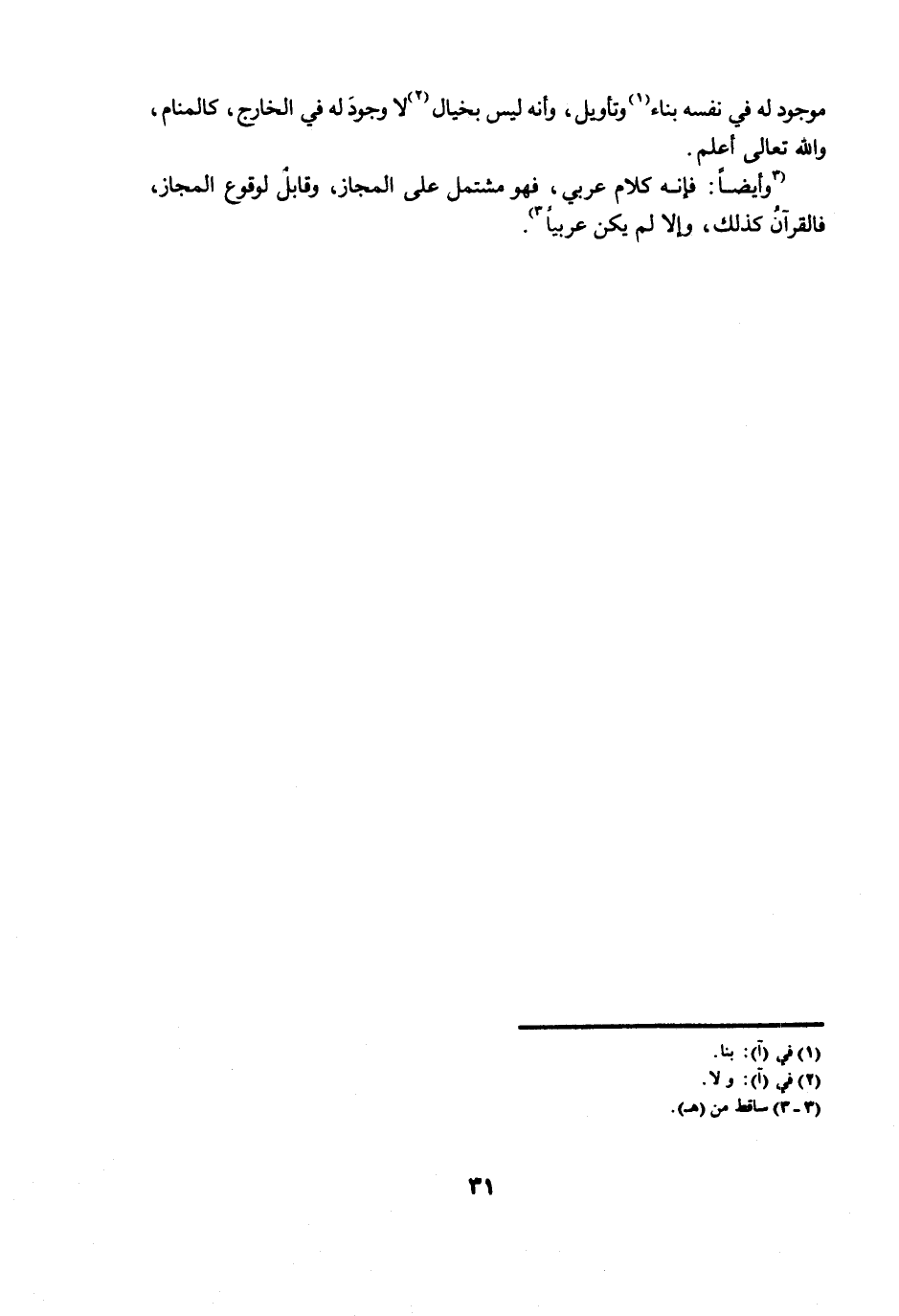 وَأَيْضًا: فَإِنَّهُ كَلَامٌ عَرَبِيٌّ ; فَهُوَ مُشْتَمِلٌ عَلَى الْمَجَازِ، وَقَابِلٌ لِوُقُوعِ الْمَجَازِ ; فَالْقُرْآنُ كَذَلِكَ، وَإِلَّا لَمْ يَكُنْ عَرَبِيًّا.