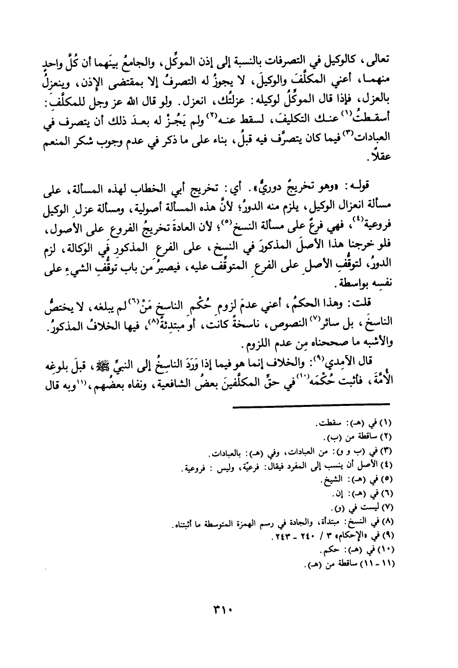 قَوْلُهُ: «وَهُوَ تَخْرِيجٌ دَوْرِيٌّ» ، أَيْ: تَخْرِيجُ أَبِي الْخَطَّابِ لِهَذِهِ الْمَسْأَلَةِ، عَلَى مَسْأَلَةِ انْعِزَالِ الْوَكِيلِ، يَلْزَمُ مِنْهُ الدَّوْرُ ; لِأَنَّ هَذِهِ الْمَسْأَلَةَ أُصُولِيَّةٌ، وَمَسْأَلَةُ عَزْلِ الْوَكِيلِ فَرْعِيَّةٌ ; فَهِيَ فَرْعٌ عَلَى مَسْأَلَةِ النَّسْخِ ; لِأَنَّ الْعَادَةَ تَخْرِيجُ الْفُرُوعِ عَلَى الْأُصُولِ ; فَلَوْ خَرَّجْنَا هَذَا الْأَصْلَ الْمَذْكُورَ فِي النَّسْخِ عَلَى الْفَرْعِ الْمَذْكُورِ فِي الْوَكَالَةِ، لَزِمَ الدَّوْرُ، لِتَوَقُّفِ الْأَصْلِ عَلَى الْفَرْعِ الْمُتَوَقِّفِ عَلَيْهِ ; فَيَصِيرُ مِنْ بَابِ تَوَقُّفِ الشَّيْءِ عَلَى نَفْسِهِ بِوَاسِطَةٍ.