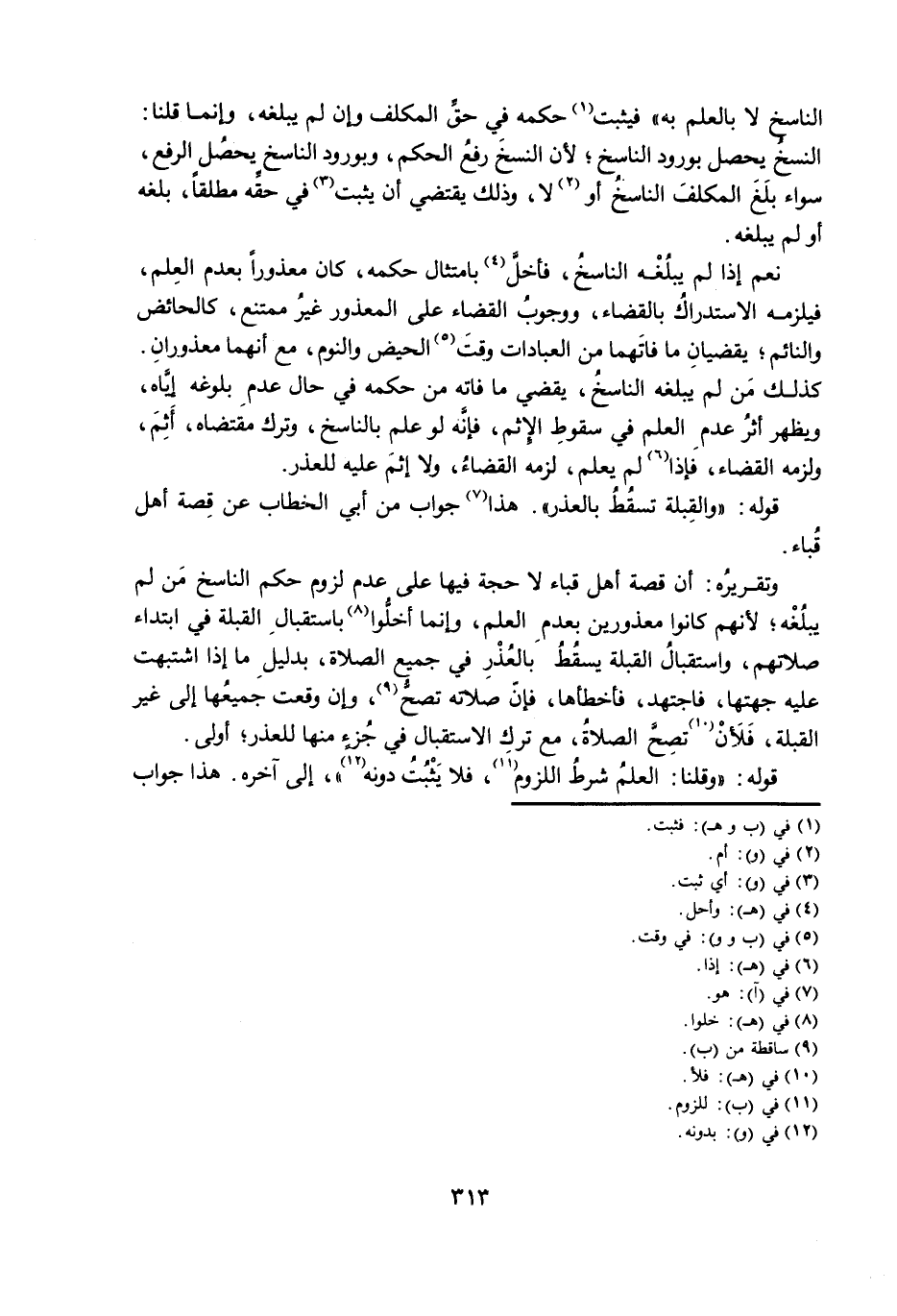 وَتَقْرِيرُهُ: أَنَّ قِصَّةَ أَهْلِ قُبَاءَ لَا حُجَّةَ فِيهَا عَلَى عَدَمِ لُزُومِ حُكْمِ النَّاسِخِ مَنْ لَمْ يَبْلُغْهُ ; لِأَنَّهُمْ كَانُوا مَعْذُورِينَ بِعَدَمِ الْعِلْمِ، وَإِنَّمَا أَخَلُّوا بِاسْتِقْبَالِ الْقِبْلَةِ فِي ابْتِدَاءِ صَلَاتِهِمْ، وَاسْتِقْبَالُ الْقِبْلَةِ يَسْقُطُ بِالْعُذْرِ فِي جَمِيعِ الصَّلَاةِ، بِدَلِيلِ مَا إِذَا اشْتَبَهَتْ عَلَيْهِ جِهَتُهَا ; فَاجْتَهَدَ ; فَأَخْطَأَهَا، فَإِنَّ صَلَاتَهُ تَصِحُّ، وَإِنْ وَقَعَتْ جَمِيعُهَا إِلَى غَيْرِ الْقِبْلَةِ ; فَلَأَنْ تَصِحَّ الصَّلَاةُ، مَعَ تَرْكِ الِاسْتِقْبَالِ فِي جُزْءٍ مِنْهَا لِلْعُذْرِ، أَوْلَى.