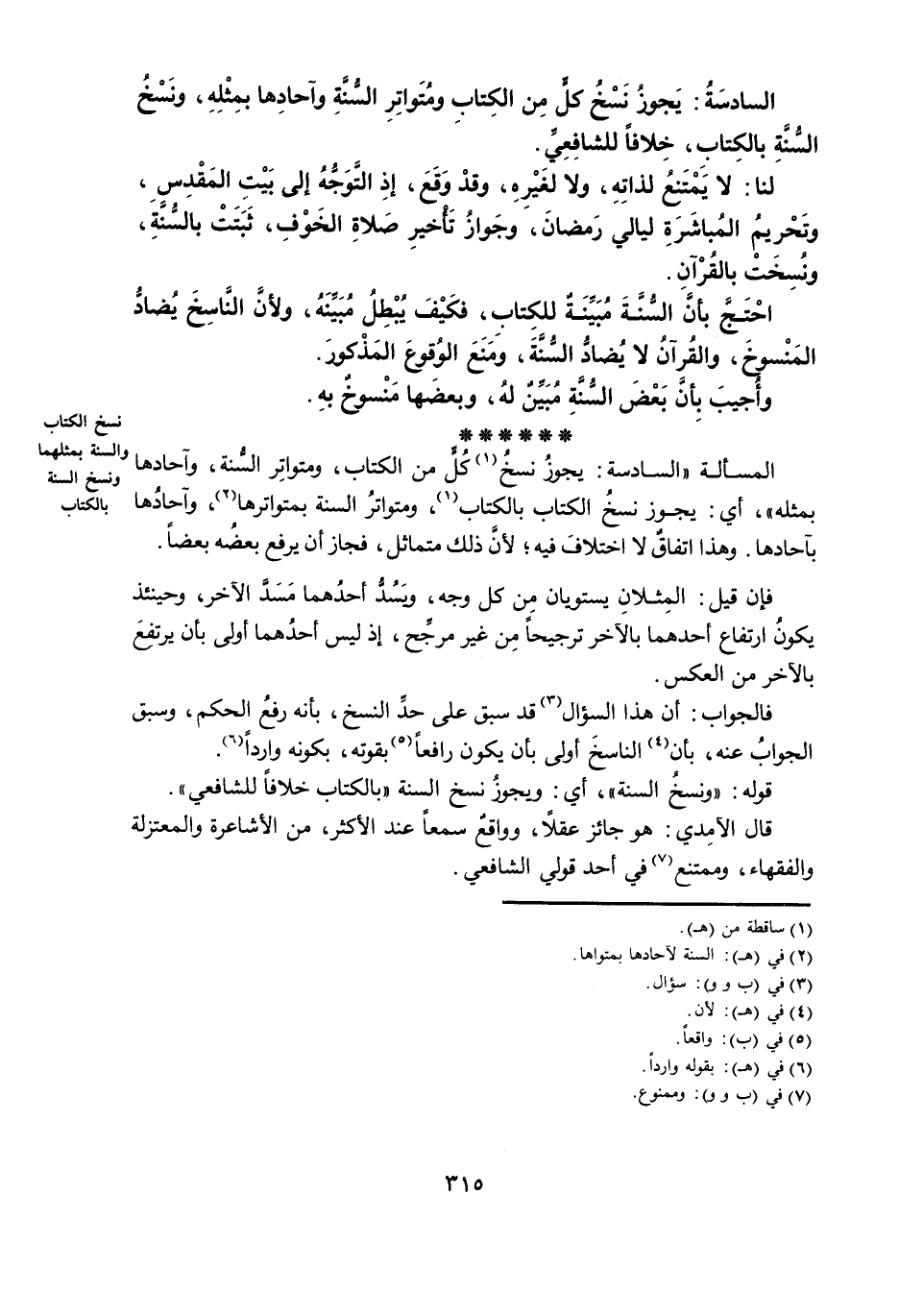 السَّادِسَةُ: يَجُوزُ نَسْخُ كُلٍّ مِنَ الْكِتَابِ وَمُتَوَاتِرِ السُّنَّةِ وَآحَادِهَا بِمِثْلِهِ، وَنَسْخُ السُّنَّةِ بِالْكِتَابِ، خِلَافًا لِلشَّافِعِيِّ.