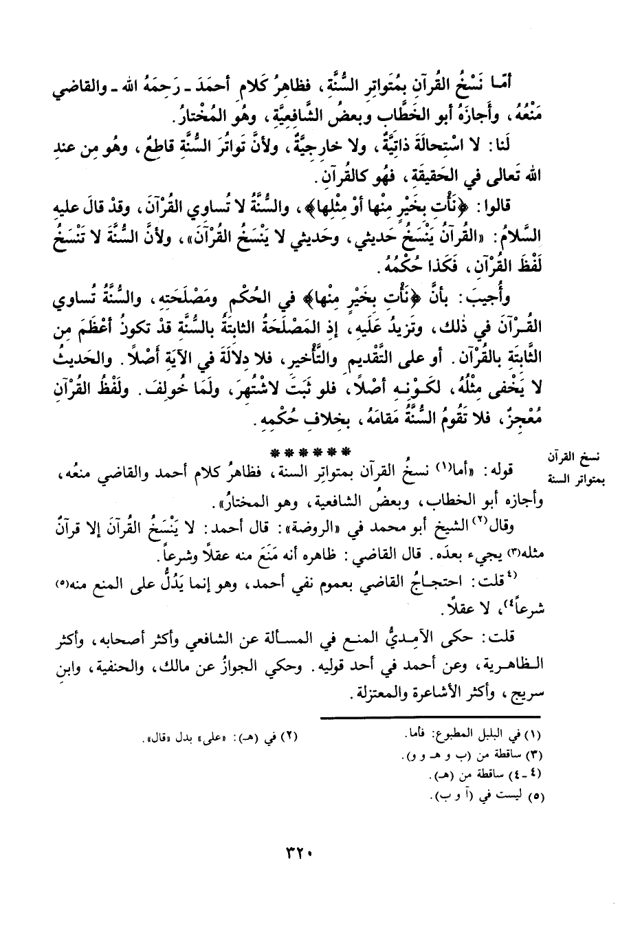 قَوْلُهُ: " أَمَّا نَسْخُ الْقُرْآنِ بِمُتَوَاتِرِ السُّنَّةِ ; فَظَاهِرُ كَلَامِ أَحْمَدَ وَالْقَاضِي مَنَعَهُ، وَأَجَازَهُ أَبُو الْخَطَّابِ، وَبَعْضُ الشَّافِعِيَّةِ، وَهُوَ الْمُخْتَارُ ".