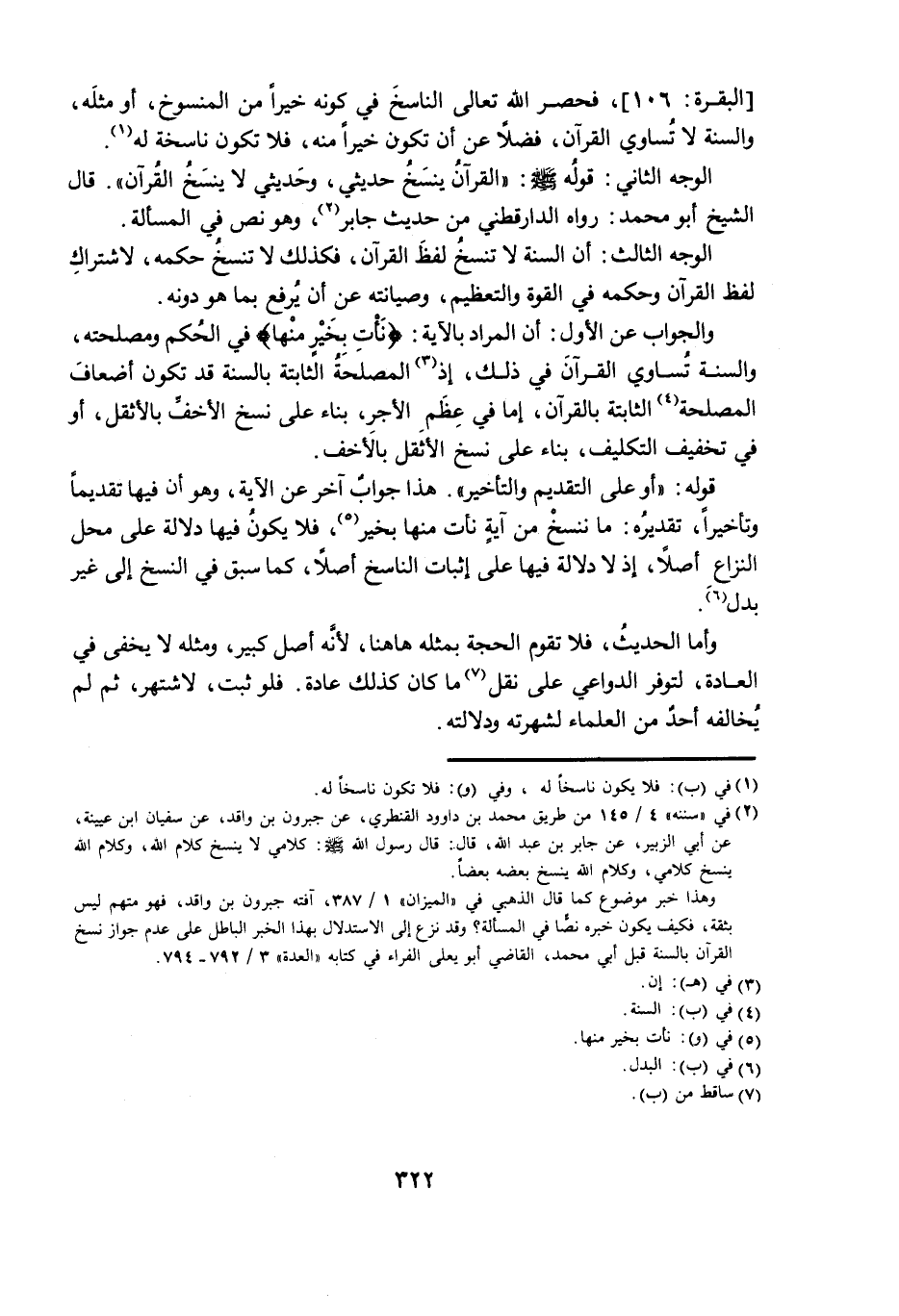 [الْبَقَرَةِ: 106] ; فَحَصَرَ اللَّهُ تَعَالَى النَّاسِخَ فِي كَوْنِهِ خَيْرًا مِنَ الْمَنْسُوخِ، أَوْ مِثْلَهُ، وَالسُّنَّةُ لَا تُسَاوِي الْقُرْآنَ ; فَضْلًا عَنْ أَنْ تَكُونَ خَيْرًا مِنْهُ ; فَلَا تَكُونُ نَاسِخَةً لَهُ.