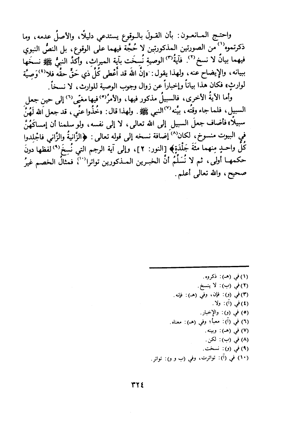 وَاحْتَجَّ الْمَانِعُونَ: بِأَنَّ الْقَوْلَ بِالْوُقُوعِ يَسْتَدْعِي دَلِيلًا، وَالْأَصْلُ عَدَمُهُ، وَمَا ذَكَرْتُمُوهُ مِنَ الصُّورَتَيْنِ الْمَذْكُورَتَيْنِ لَا حُجَّةَ فِيهِمَا عَلَى الْوُقُوعِ، بَلِ النَّصُّ النَّبَوِيُّ فِيهِمَا بَيَانٌ لَا نَسْخٌ. فَآيَةُ الْوَصِيَّةِ نُسِخَتْ بِآيَةِ الْمِيرَاثِ، وَأَكَّدَ النَّبِيُّ صَلَّى اللَّهُ عَلَيْهِ وَسَلَّمَ، نَسْخَهَا بِبَيَانِهِ، وَالْإِيضَاحِ عَنْهُ، وَلِهَذَا يَقُولُ: إِنَّ اللَّهَ قَدْ أَعْطَى كُلَّ ذِي حَقٍّ حَقَّهُ فَلَا وَصِيَّةَ لِوَارِثٍ. فَكَانَ هَذَا بَيَانًا وَإِخْبَارًا عَنْ زَوَالِ وُجُوبِ الْوَصِيَّةِ لِلْوَارِثِ، لَا نَسْخًا.