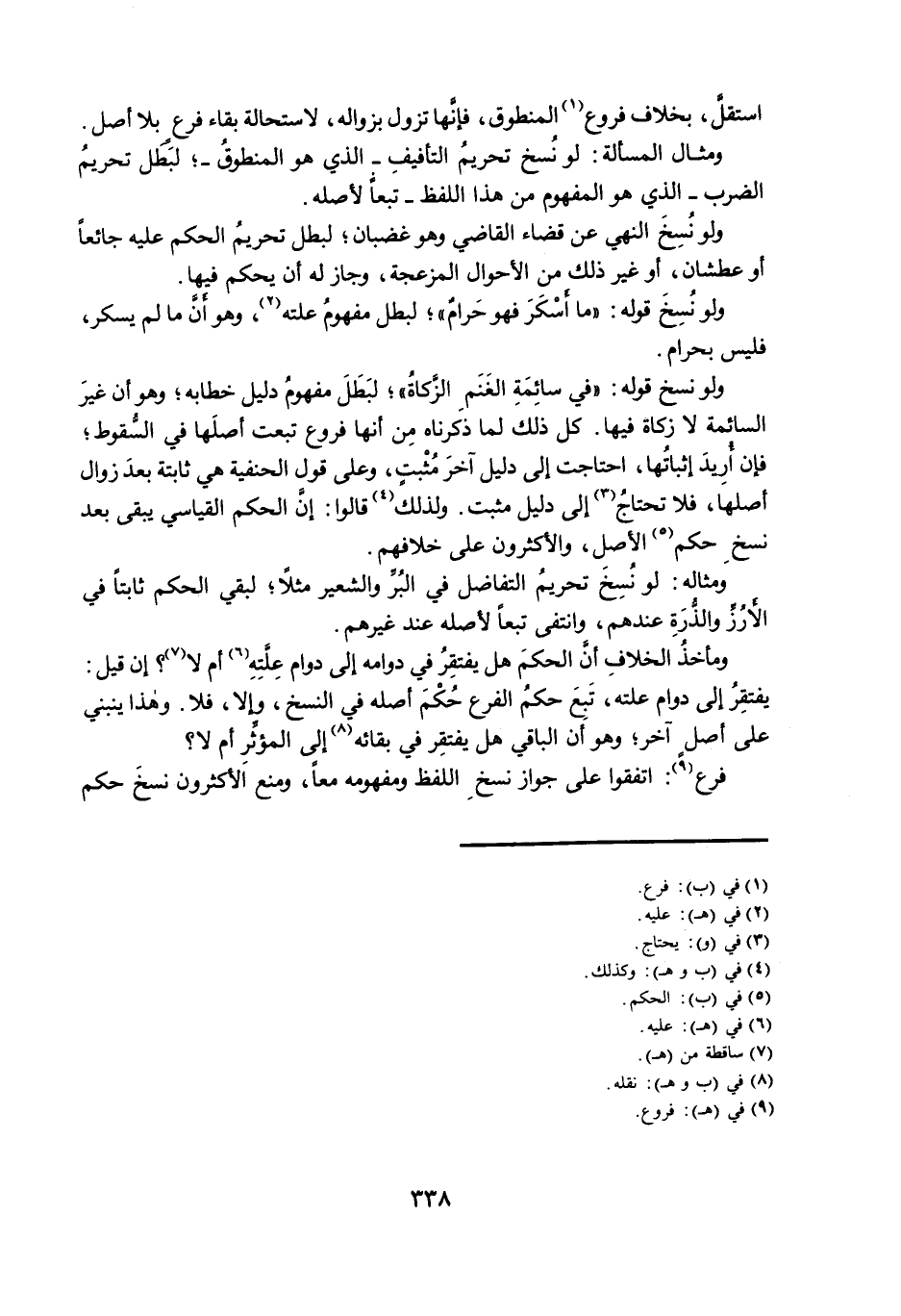 وَلَوْ نُسِخَ قَوْلُهُ: «فِي سَائِمَةِ الْغَنَمِ الزَّكَاةُ» ; لَبَطَلَ مَفْهُومُ دَلِيلِ خِطَابِهِ ; وَهُوَ أَنَّ غَيْرَ السَّائِمَةِ لَا زَكَاةَ فِيهَا. كُلُّ ذَلِكَ لِمَا ذَكَرْنَاهُ مِنْ أَنَّهَا فُرُوعٌ تَبِعَتْ أَصْلَهَا فِي السُّقُوطِ، فَإِنْ أُرِيدَ إِثْبَاتُهَا، احْتَاجَتْ إِلَى دَلِيلٍ آخَرَ مُثْبِتٍ، وَعَلَى قَوْلِ الْحَنَفِيَّةِ هِيَ ثَابِتَةٌ بَعْدَ زَوَالِ أَصْلِهَا ; فَلَا تَحْتَاجُ إِلَى دَلِيلٍ مُثْبِتٍ. وَلِذَلِكَ قَالُوا: إِنَّ الْحُكْمَ الْقِيَاسِيَّ يَبْقَى بَعْدَ نَسْخِ حُكْمِ الْأَصْلِ، وَالْأَكْثَرُونَ عَلَى خِلَافِهِمْ.
