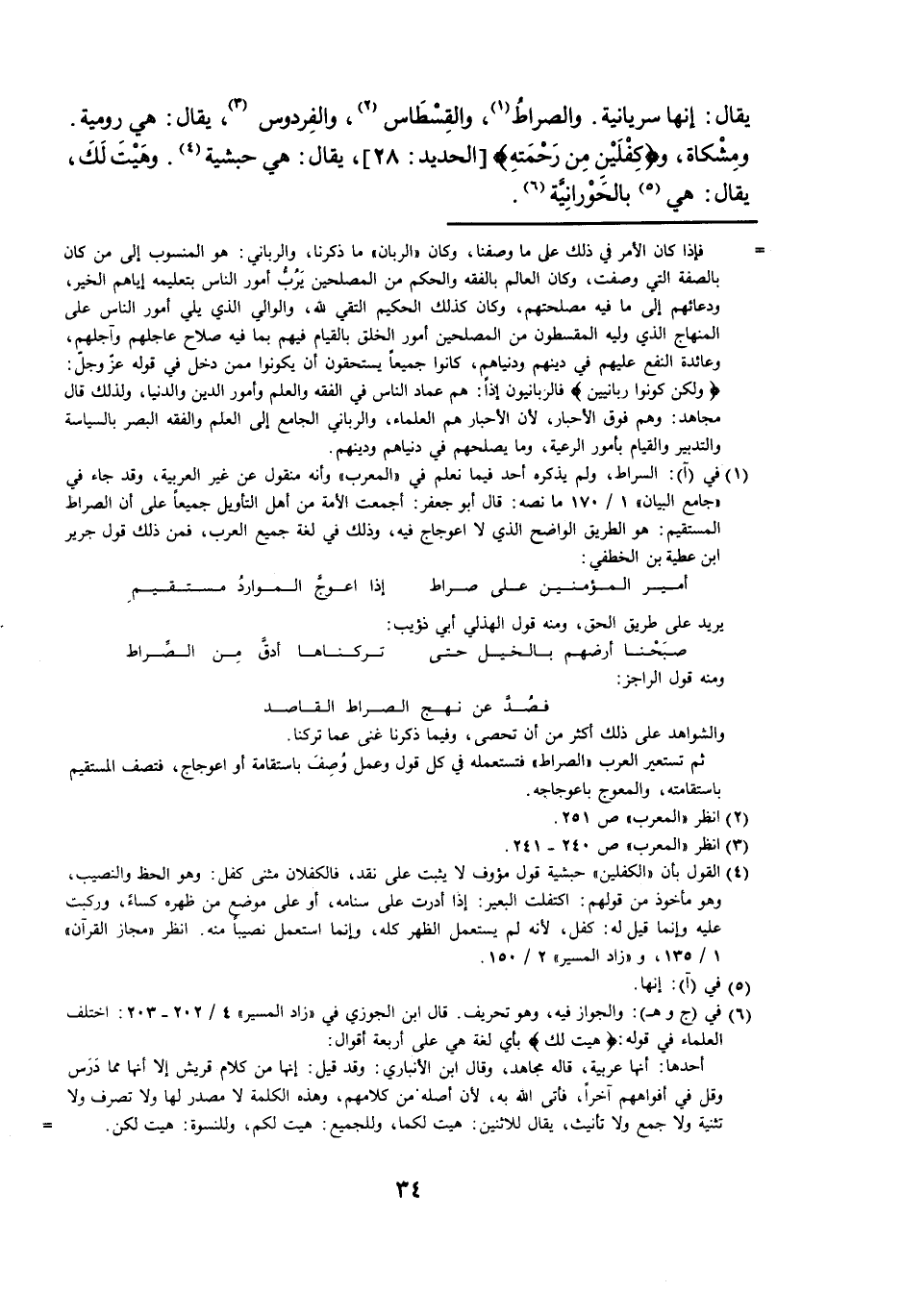 يُقَالُ: إِنَّهَا سُرْيَانِيَّةٌ، وَالصِّرَاطُ، وَالْقِسْطَاسُ، وَالْفِرْدَوْسُ، يُقَالُ: هِيَ رُومِيَّةٌ. وَمِشْكَاةٌ، وَ {كِفْلَيْنِ مِنْ رَحْمَتِهِ} [الْحَدِيدِ: 28] ، يُقَالُ: هِيَ حَبَشِيَّةٌ، وَهَيْتَ لَكَ، يُقَالُ: هِيَ بِالْحَوْرَانِيَّةِ.