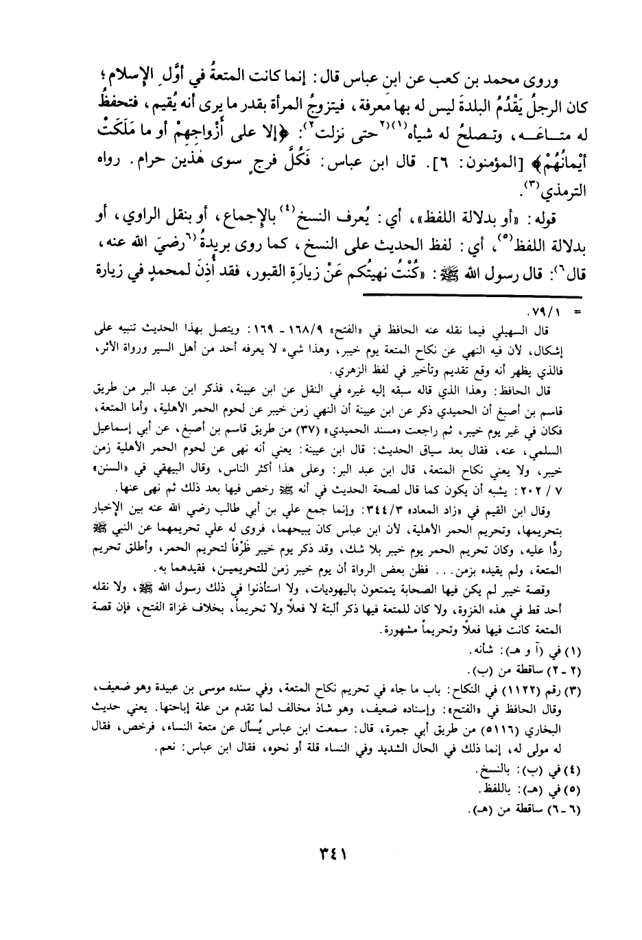 وَرَوَى مُحَمَّدُ بْنُ كَعْبٍ عَنِ ابْنِ عَبَّاسٍ قَالَ: إِنَّمَا كَانَتِ الْمُتْعَةُ فِي أَوَّلِ الْإِسْلَامِ، كَانَ الرَّجُلُ يَقْدُمُ الْبَلْدَةَ لَيْسَ لَهُ بِهَا مَعْرِفَةٌ ; فَيَتَزَوَّجُ الْمَرْأَةَ بِقَدْرِ مَا يَرَى أَنَّهُ يُقِيمُ ; فَتَحْفَظُ لَهُ مَتَاعَهُ، وَتُصْلِحُ شَيْأَهُ حَتَّى نَزَلَتْ: {إِلَّا عَلَى أَزْوَاجِهِمْ أوْ مَا مَلَكَتْ أَيْمَانُهُمْ} [الْمُؤْمِنُونَ: 6] . قَالَ ابْنُ عَبَّاسٍ: فَكُلُّ فَرْجٍ سِوَى هَذَيْنِ حَرَامٌ. رَوَاهُ التِّرْمِذِيُّ.