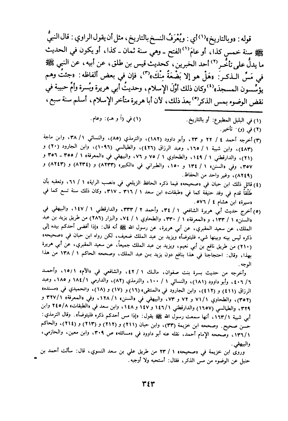 قَوْلُهُ: «وَبِالتَّارِيخِ» ، أَيْ: وَيُعْرَفُ النَّسْخُ بِالتَّارِيخِ، مِثْلَ أَنْ يَقُولَ الرَّاوِي: قَالَ النَّبِيُّ صَلَّى اللَّهُ عَلَيْهِ وَسَلَّمَ، سَنَةَ خَمْسٍ كَذَا، أَوْ عَامَ الْفَتْحِ - وَهِيَ سَنَةُ ثَمَانٍ - كَذَا، أَوْ يَكُونَ فِي الْحَدِيثِ مَا يَدُلُّ عَلَى تَأَخُّرِ أَحَدِ الْخَبَرَيْنِ، كَحَدِيثِ قَيْسِ بْنِ طَلْقٍ، عَنْ أَبِيهِ، عَنِ النَّبِيِّ صَلَّى اللَّهُ عَلَيْهِ وَسَلَّمَ، فِي مَسِّ الذَّكَرِ: هَلْ هُوَ إِلَّا بَضْعَةٌ مِنْكَ، فَإِنَّ فِي بَعْضِ أَلْفَاظِهِ: جِئْتُ وَهُمْ يُؤَسِّسُونَ الْمَسْجِدَ، وَكَانَ ذَلِكَ أَوَّلَ الْإِسْلَامِ، وَحَدِيثِ أَبِي هُرَيْرَةَ وَبُسْرَةَ وَأُمِّ حَبِيبَةَ فِي نَقْضِ الْوُضُوءِ بِمَسِّ الذَّكَرِ بَعْدَ ذَلِكَ ; لِأَنَّ أَبَا هُرَيْرَةَ مُتَأَخِّرُ الْإِسْلَامِ، أَسْلَمَ سَنَةَ سَبْعٍ،
