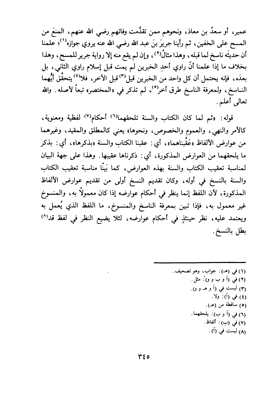 عُمَيْرٍ، أَوْ سَعْدُ بْنُ مُعَاذٍ، وَنَحْوُهُمْ مِمَّنْ تَقَدَّمَتْ وَفَاتُهُمْ رَضِيَ اللَّهُ عَنْهُمْ، الْمَنْعَ مِنَ الْمَسْحِ عَلَى الْخُفَّيْنِ، ثُمَّ رَأَيْنَا جَرِيرَ بْنَ عَبْدِ اللَّهِ رَضِيَ اللَّهُ عَنْهُ يَرْوِي جَوَازَهُنَّ عَلِمْنَا أَنَّ حَدِيثَهُ نَاسِخٌ لِمَا قَبْلَهُ، وَهَذَا مِثَالٌ، وَإِنْ لَمْ يَقَعْ مِنْهُ إِلَّا رِوَايَةُ جَرِيرٍ لِلْمَسْحِ، وَهَذَا بِخِلَافِ مَا إِذَا عَلِمْنَا أَنَّ رَاوِيَ أَحَدِ الْخَبَرَيْنِ لَمْ يَمُتْ قَبْلَ إِسْلَامِ رَاوِي الثَّانِي، بَلْ بَعْدَهُ ; فَإِنَّهُ يُحْتَمَلُ أَنَّ كُلَّ وَاحِدٍ مِنَ الْخَبَرَيْنِ قِيلَ قَبْلَ الْآخَرِ ; فَلَا يَتَحَقَّقُ أَيُّهُمَا النَّاسِخُ، وَلِمَعْرِفَةِ النَّاسِخِ طُرُقٌ أُخَرُ، لَمْ تُذْكَرْ فِي «الْمُخْتَصَرِ» تَبَعًا لِأَصْلِهِ، وَاللَّهُ تَعَالَى أَعْلَمُ.