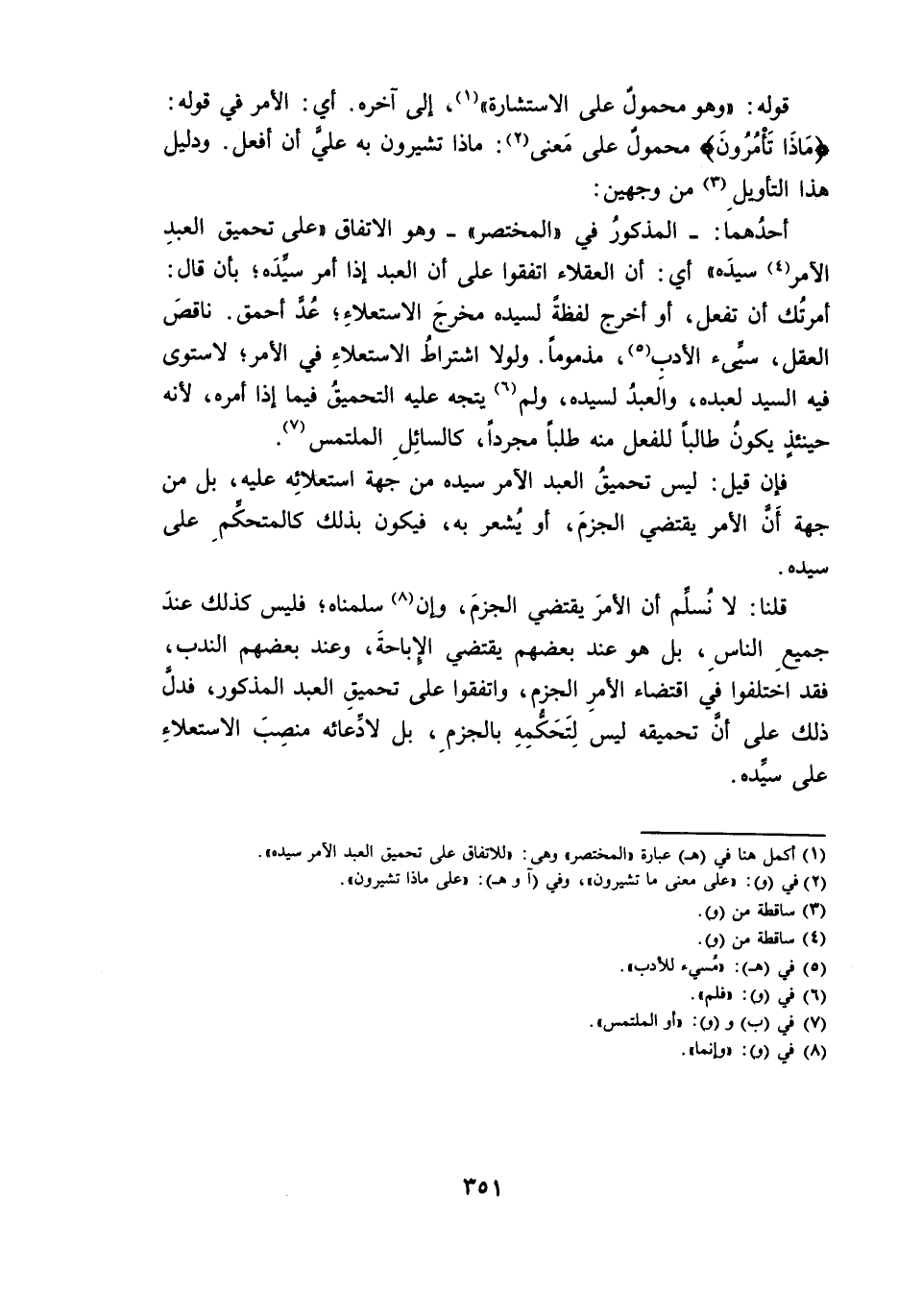 فَإِنْ قِيلَ: لَيْسَ تَحْمِيقُ الْعَبْدِ الْآمِرِ سَيِّدَهُ مِنْ جِهَةِ اسْتِعْلَائِهِ عَلَيْهِ، بَلْ مِنْ جِهَةِ أَنَّ الْأَمْرَ يَقْتَضِي الْجَزْمَ، أَوْ يُشْعِرُ بِهِ ; فَيَكُونُ بِذَلِكَ كَالْمُتَحَكِّمِ عَلَى سَيِّدِهِ.
