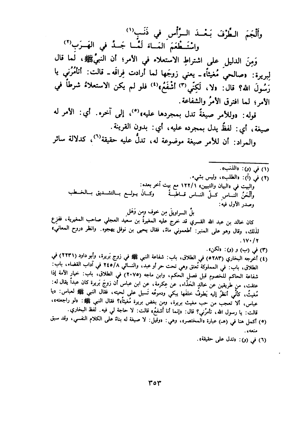 وَمِنَ الدَّلِيلِ عَلَى اشْتِرَاطِ الِاسْتِعْلَاءِ فِي الْأَمْرِ ; أَنَّ النَّبِيَّ، صَلَّى اللَّهُ عَلَيْهِ وَسَلَّمَ، لَمَّا قَالَ لِبَرِيرَةَ: صَالِحِي مُغِيثًا - يَعْنِي زَوْجَهَا لَمَّا أَرَادَتْ فِرَاقَهُ - قَالَتْ: أَتَأْمُرُنِي يَا رَسُولَ اللَّهِ؟ قَالَ: لَا، لَكِنِّي أَشْفَعُ، فَلَوْ لَمْ يَكُنِ الِاسْتِعْلَاءُ شَرْطًا فِي الْأَمْرِ، لَمَا افْتَرَقَ الْأَمْرُ وَالشَّفَاعَةُ.