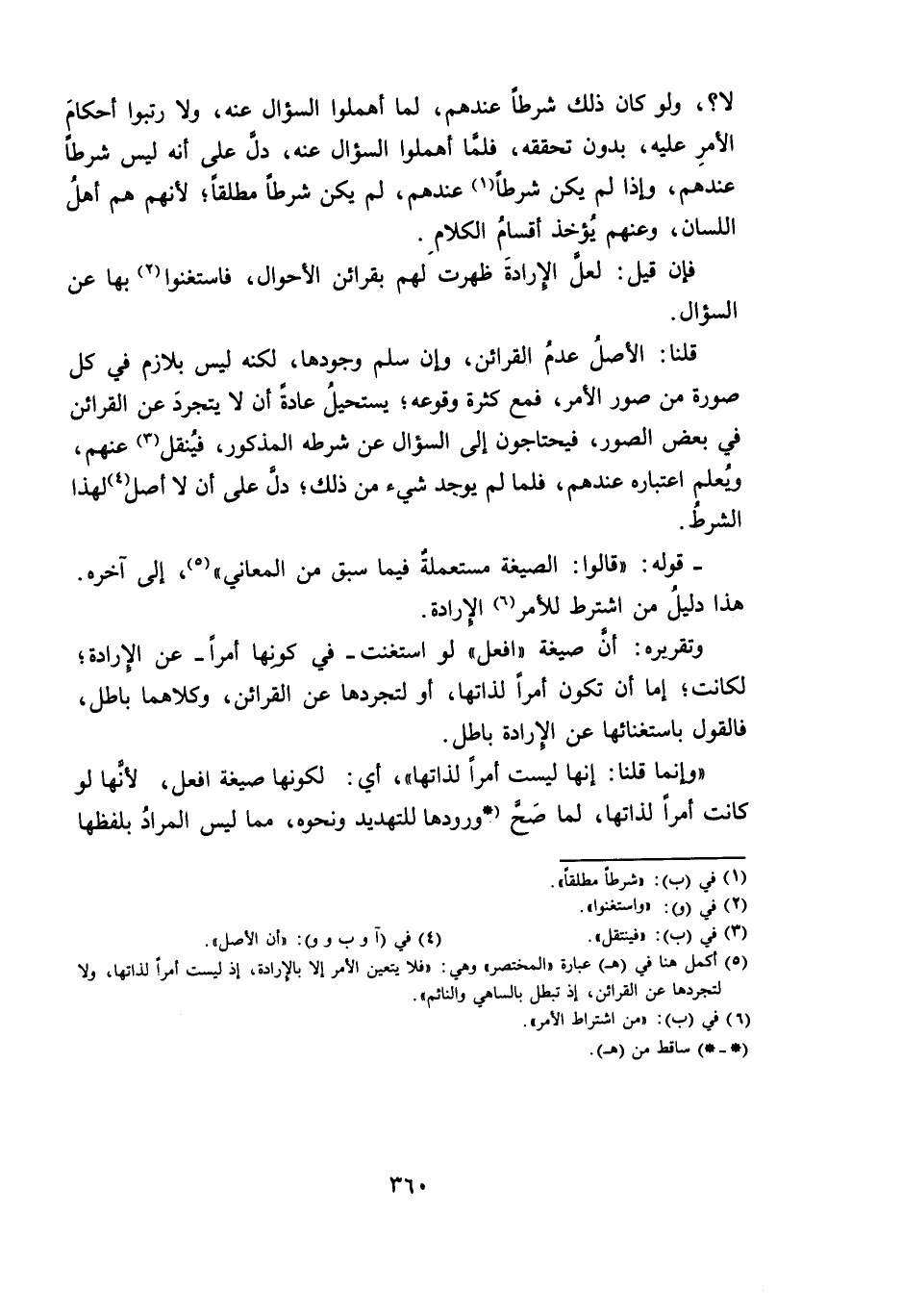 وَتَقْرِيرُهُ: أَنَّ صِيغَةَ «افْعَلْ» لَوِ اسْتَغْنَتْ - فِي كَوْنِهَا أَمْرًا - عَنِ الْإِرَادَةِ ; لَكَانَتْ ; إِمَّا أَنْ تَكُونَ أَمْرًا لِذَاتِهَا، أَوْ لِتَجَرُّدِهَا عَنِ الْقَرَائِنِ، وَكِلَاهُمَا بَاطِلٌ ; فَالْقَوْلُ بِاسْتِغْنَائِهَا عَنِ الْإِرَادَةِ بَاطِلٌ.