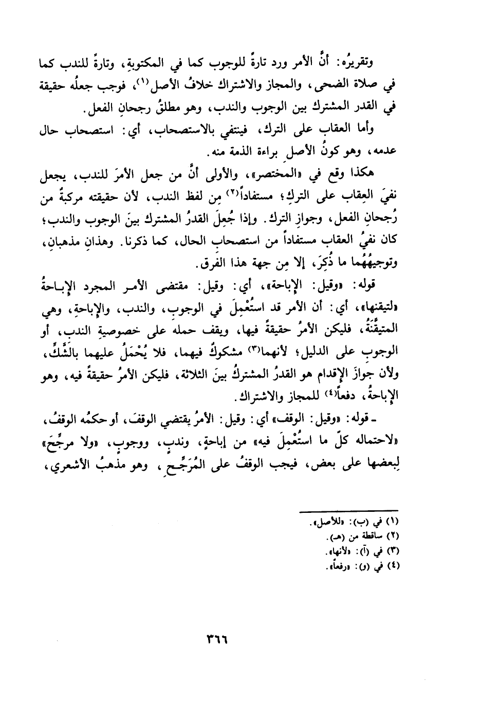 هَكَذَا وَقَعَ فِي» الْمُخْتَصَرِ «، وَالْأَوْلَى أَنَّ مَنْ جَعَلَ الْأَمْرَ لِلنَّدْبِ، يَجْعَلُ نَفْيَ الْعِقَابِ عَلَى التَّرْكِ، مُسْتَفَادًا مِنْ لَفْظِ النَّدْبِ ; لِأَنَّ حَقِيقَتَهُ مُرَكَّبَةٌ مِنْ رُجْحَانِ الْفِعْلِ، وَجَوَازِ التَّرْكِ. وَإِذَا جُعِلَ الْقَدْرُ الْمُشْتَرَكُ بَيْنَ الْوُجُوبِ وَالنَّدْبِ، كَانَ نَفْيُ الْعِقَابِ مُسْتَفَادًا مِنِ اسْتِصْحَابِ الْحَالِ، كَمَا ذَكَرْنَا. وَهَذَانِ مَذْهَبَانِ، وَتَوْجِيهُهُمَا مَا ذُكِرَ، إِلَّا مِنْ جِهَةِ هَذَا الْفَرْقِ.