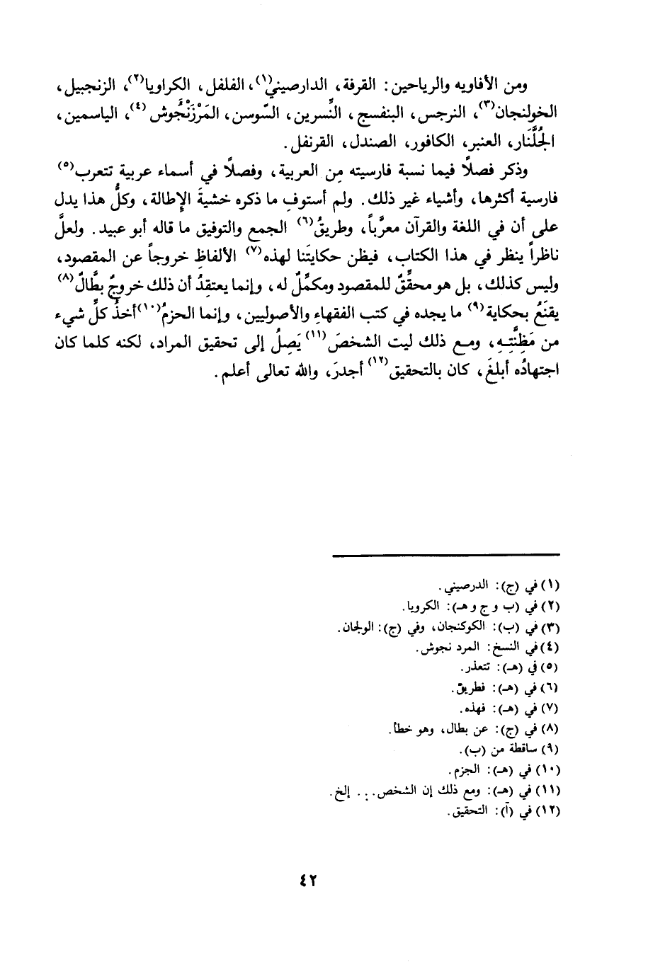 وَذَكَرَ فَصْلًا فِيمَا نِسْبَةُ فَارِسِيَّتِهِ مِنَ الْعَرَبِيَّةِ، وَفَصْلًا فِي أَسْمَاءٍ عَرَبِيَّةٍ تَتَعَرَّبُ فَارِسِيَّةً أَكْثَرُهَا، وَأَشْيَاءَ غَيْرَ ذَلِكَ. وَلَمْ أَسْتَوْفِ مَا ذَكَرَهُ خَشْيَةَ الْإِطَالَةِ، وَكُلُّ هَذَا يَدُلُّ عَلَى أَنَّ فِي اللُّغَةِ وَالْقُرْآنِ مُعَرَّبًا، وَطَرِيقُ الْجَمْعِ وَالتَّوْفِيقِ مَا قَالَهُ أَبُو عُبَيْدٍ، وَلَعَلَّ نَاظِرًا يَنْظُرُ فِي هَذَا الْكِتَابِ ; فَيَظُنُّ حِكَايَتَنَا لِهَذِهِ الْأَلْفَاظِ خُرُوجًا عَنِ الْمَقْصُودِ، وَلَيْسَ كَذَلِكَ، بَلْ هُوَ مُحَقِّقٌ لِلْمَقْصُودِ وَمُكَمِّلٌ لَهُ، وَإِنَّمَا يَعْتَقِدُ أَنَّ ذَلِكَ خُرُوجٌ بَطَّالٌ يَقْنَعُ بِحِكَايَةِ مَا يَجِدُهُ فِي كُتُبِ الْفُقَهَاءِ وَالْأُصُولِيِّينَ، وَإِنَّمَا الْحَزْمُ أَخْذُ كُلِّ شَيْءٍ مِنْ مَظِنَّتِهِ، وَمَعَ ذَلِكَ لَيْتَ الشَّخْصَ يَصِلُ إِلَى تَحْقِيقِ الْمُرَادِ، لَكِنَّهُ كُلَّمَا كَانَ اجْتِهَادُهُ أَبْلَغَ، كَانَ بِالتَّحْقِيقِ أَجْدَرُ، وَاللَّهُ تَعَالَى أَعْلَمُ.