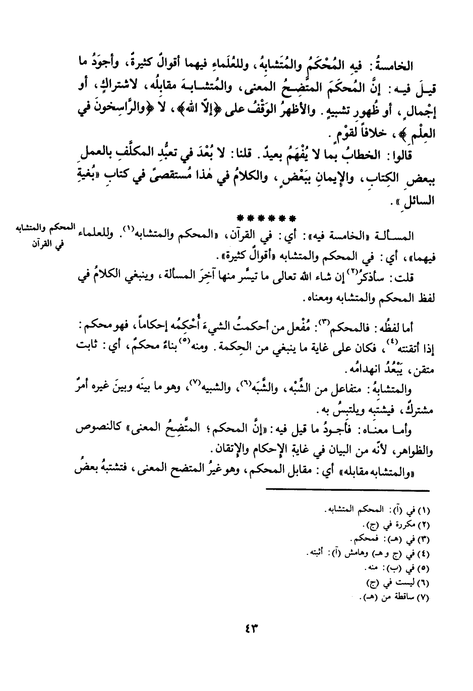 الْخَامِسَةُ: فِيهِ الْمُحْكَمُ وَالْمُتَشَابِهُ، وَلِلْعُلَمَاءِ فِيهِمَا أَقْوَالٌ كَثِيرَةٌ، وَأَجْوَدُ مَا قِيلَ فِيهِ: إِنَّ الْمُحْكَمُ الْمُتَّضِحُ الْمَعْنَى، وَالْمُتَشَابِهَ مُقَابِلُهُ، لِاشْتِرَاكٍ، أَوْ إِجْمَالٍ، أَوْ ظُهُورِ تَشْبِيهٍ. وَالْأَظْهَرُ الْوَقْفُ عَلَى إِلَّا اللَّهُ، لَا {وَالرَّاسِخُونَ فِي الْعِلْمِ} ، خِلَافًا لِقَوْمٍ.
