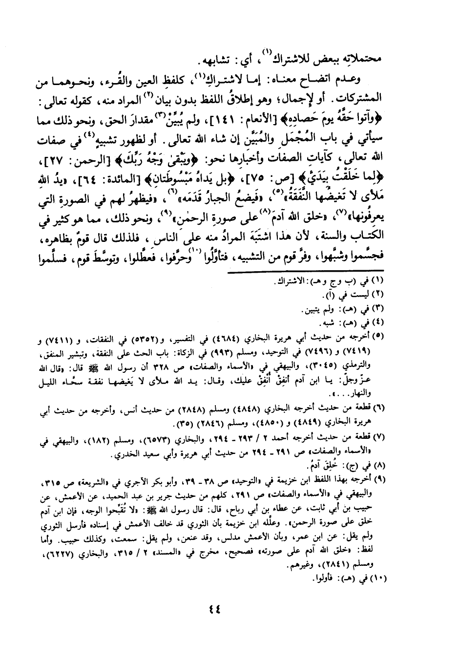 وَعَدَمُ اتِّضَاحِ مَعْنَاهُ: إِمَّا لِاشْتِرَاكٍ، كَلَفْظِ الْعَيْنِ وَالْقُرْءِ، وَنَحْوِهِمَا مِنَ الْمُشْتَرِكَاتِ، أَوْ لِإِجْمَالٍ ; وَهُوَ إِطْلَاقُ اللَّفْظِ بِدُونِ بَيَانِ الْمُرَادِ مِنْهُ، كَقَوْلِهِ تَعَالَى: {وَآتُوا حَقَّهُ يَوْمَ حَصَادِهِ} [الْأَنْعَامِ: 141] ، وَلَمْ يُبَيِّنْ مِقْدَارَ الْحَقِّ، وَنَحْوَ ذَلِكَ مِمَّا سَيَأْتِي فِي بَابِ الْمُجْمَلِ وَالْمُبَيَّنِ إِنْ شَاءَ اللَّهُ تَعَالَى. أَوْ لِظُهُورِ تَشْبِيهٍ فِي صِفَاتِ اللَّهِ تَعَالَى، كَآيَاتِ الصِّفَاتِ وَأَخْبَارِهَا نَحْوَ: {وَيَبْقَى وَجْهُ رَبِّكَ} [الرَّحْمَنِ: 27] ، {لِمَا خَلَقْتُ بِيَدَيَّ} [ص: 75] ، {بَلْ يَدَاهُ مَبْسُوطَتَانِ} [الْمَائِدَةِ: 64] ، يَدُ اللَّهِ مَلْأَى لَا تُغِيضُهَا النَّفَقَةُ، فَيَضَعُ الْجَبَّارُ قَدَمَهُ، فَيَظْهَرُ لَهُمْ فِي الصُّورَةِ الَّتِي يَعْرِفُونَهَا، خَلَقَ اللَّهُ آدَمَ عَلَى صُورَةِ الرَّحْمَنِ، وَنَحْوَ ذَلِكَ، مِمَّا هُوَ كَثِيرٌ فِي الْكِتَابِ وَالسُّنَّةِ ; لِأَنَّ هَذَا اشْتَبَهَ الْمُرَادُ مِنْهُ عَلَى النَّاسِ ; فَلِذَلِكَ قَالَ قَوْمٌ بِظَاهِرِهِ ; فَجَسَّمُوا وَشَبَّهُوا، وَفَرَّ قَوَّمَ مِنَ التَّشْبِيهِ ; فَتَأَوَّلُوا وَحَرَّفُوا ; فَعَطَّلُوا، وَتَوَسَّطَ قَوْمٌ ; فَسَلَّمُوا