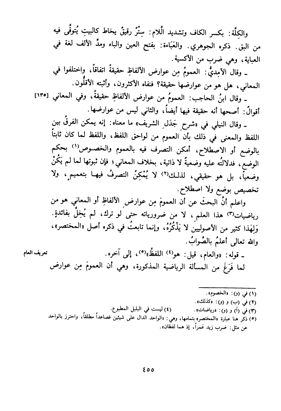 وَاعْلَمْ أَنَّ الْبَحْثَ عَنْ أَنَّ الْعُمُومَ مِنْ عَوَارِضِ الْأَلْفَاظِ أَوِ الْمَعَانِي هُوَ مِنْ رِيَاضِيَّاتِ هَذَا الْعِلْمِ، لَا مِنْ ضَرُورِيَّاتِهِ حَتَّى لَوْ تُرِكَ، لَمْ يُخِلَّ بِفَائِدَةٍ. وَلِهَذَا كَثِيرٌ مِنَ الْأُصُولِيِّينَ لَا يَذْكُرُهُ، وَإِنَّمَا تَابَعْتُ فِي ذِكْرِهِ أَصْلَ «الْمُخْتَصَرِ» وَاللَّهُ تَعَالَى أَعْلَمُ بِالصَّوَابِ.
