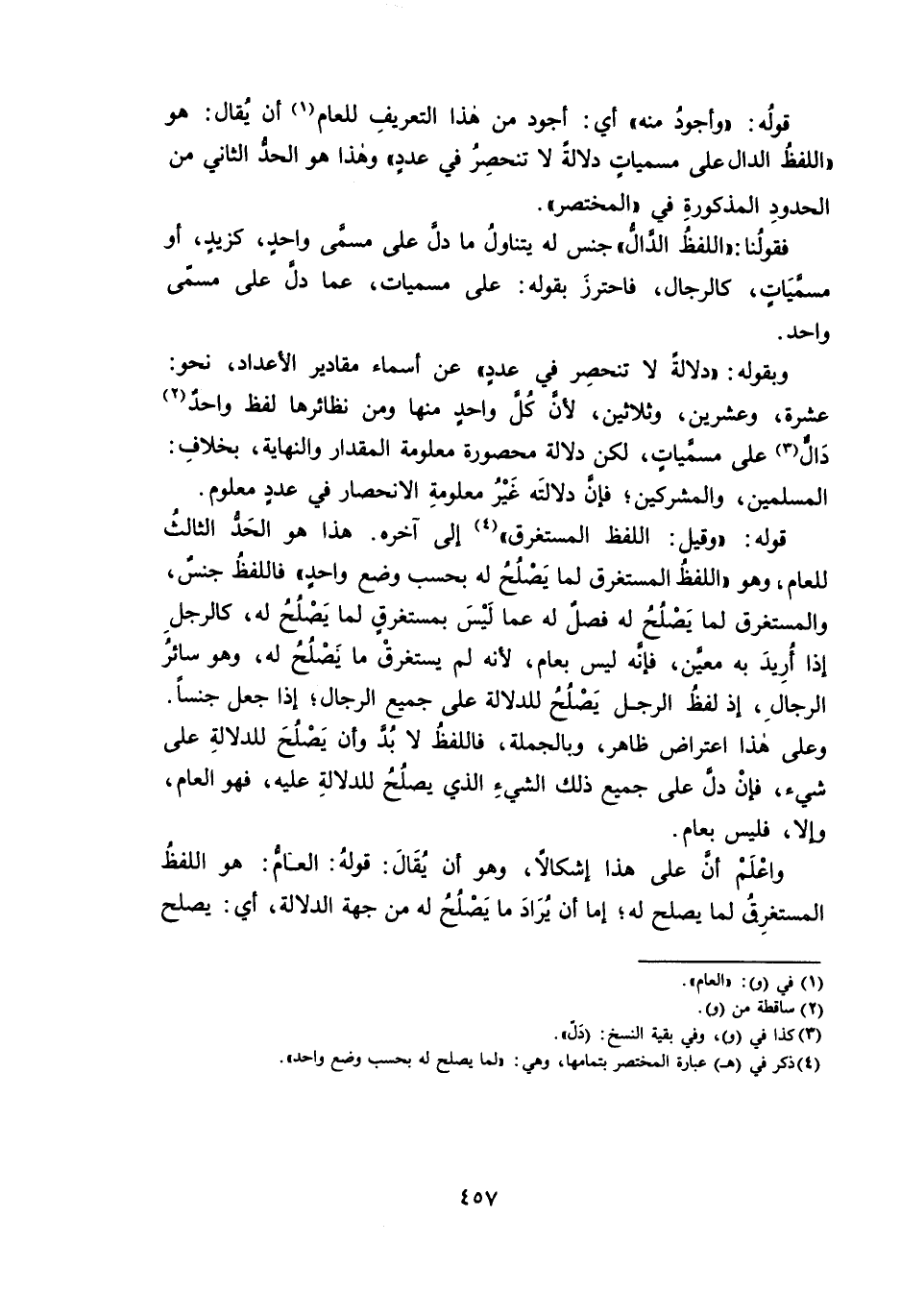 قَوْلُهُ: «وَأَجْوَدُ مِنْهُ» ، أَيْ: أَجْوَدُ مِنْ هَذَا التَّعْرِيفِ لِلْعَامِّ، أَنْ يُقَالَ: هُوَ اللَّفْظُ الدَّالُّ عَلَى مُسَمَّيَاتٍ دَلَالَةً لَا تَنْحَصِرُ فِي عَدَدٍ، وَهَذَا هُوَ الْحَدُّ الثَّانِي مِنَ الْحُدُودِ الْمَذْكُورَةِ فِي «الْمُخْتَصَرِ» .
