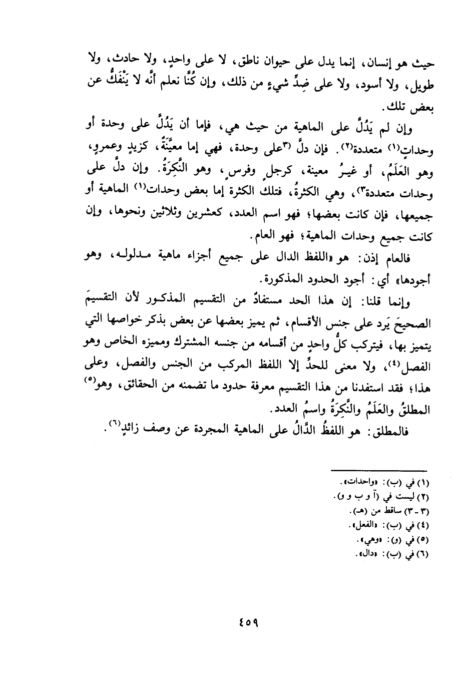 وَإِنْ لَمْ يَدُلَّ عَلَى الْمَاهِيَّةِ مِنْ حَيْثُ هِيَ ; فَإِمَّا أَنْ يَدُلَّ عَلَى وَحْدَةٍ أَوْ وَحَدَاتٍ مُتَعَدِّدَةٍ. فَإِنْ دَلَّ عَلَى وَحْدَةٍ ; فَهِيَ إِمَّا مُعَيَّنَةٌ، كَزَيْدٍ وَعَمْرٍو، وَهُوَ الْعِلْمُ، أَوْ غَيْرُ مُعَيَّنَةٌ، كَرَجُلٍ وَفَرَسٍ، وَهُوَ النَّكِرَةُ. وَإِنْ دَلَّ عَلَى وَحَدَاتٍ مُتَعَدِّدَةٍ، وَهِيَ الْكَثْرَةُ ; فَتِلْكَ الْكَثْرَةُ إِمَّا بَعْضُ وَحَدَاتِ الْمَاهِيَّةِ أَوْ جَمِيعُهَا، فَإِنْ كَانَتْ بَعْضَهَا ; فَهُوَ اسْمُ الْعَدَدِ، كَعِشْرِينَ وَثَلَاثِينَ وَنَحْوِهَا، وَإِنْ كَانَتْ جَمِيعَ وَحَدَاتِ الْمَاهِيَّةِ ; فَهُوَ الْعَامُّ.