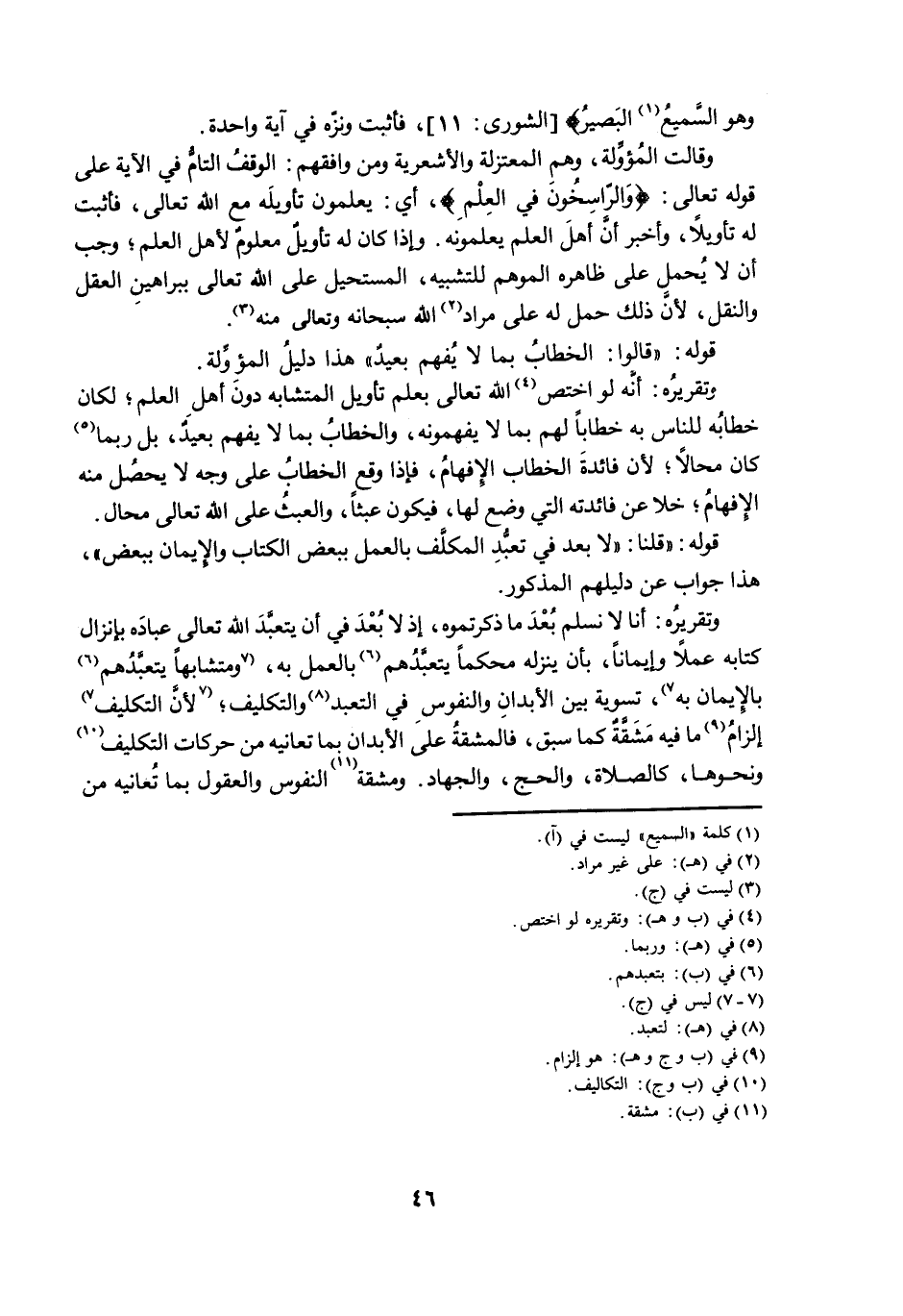 وَتَقْرِيرُهُ: أَنَّا لَا نُسَلِّمُ بَعْدَ مَا ذَكَّرْتُمُوهُ، إِذْ لَا بُعْدَ فِي أَنْ يَتَعَبَّدَ اللَّهُ تَعَالَى عِبَادَهُ بِإِنْزَالِ كِتَابِهِ عَمَلًا وَإِيمَانًا، بِأَنْ يُنْزِلَهُ مُحْكَمًا يَتَعَبَّدُهُمْ بِالْعَمَلِ بِهِ، وَمُتَشَابِهًا يَتَعَبَّدُهُمْ بِالْإِيمَانِ بِهِ، تَسْوِيَةً بَيْنَ الْأَبْدَانِ وَالنُّفُوسِ فِي التَّعَبِ وَالتَّكْلِيفِ ; لِأَنَّ التَّكْلِيفَ إِلْزَامُ مَا فِيهِ مَشَقَّةٌ كَمَا سَبَقَ ; فَالْمَشَقَّةُ عَلَى الْأَبْدَانِ بِمَا تُعَانِيهِ مِنْ حَرَكَاتِ التَّكْلِيفِ وَنَحْوِهَا، كَالصَّلَاةِ، وَالْحَجِّ، وَالْجِهَادِ. وَمَشَقَّةِ النُّفُوسِ وَالْعُقُولِ بِمَا تُعَانِيهِ مِنْ