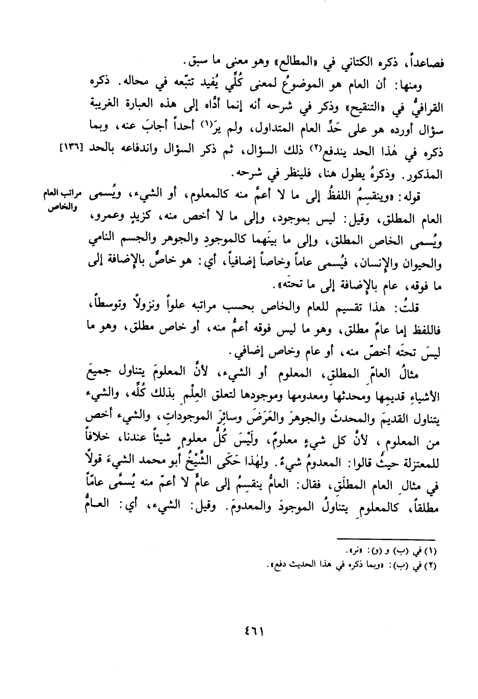 قَوْلُهُ: «وَيَنْقَسِمُ اللَّفْظُ إِلَى مَا لَا أَعَمَّ مِنْهُ كَالْمَعْلُومِ، أَوِ الشَّيْءِ، وَيُسَمَّى الْعَامَّ الْمُطْلَقَ، وَقِيلَ: لَيْسَ بِمَوْجُودٍ، وَإِلَى مَا لَا أَخَصَّ مِنْهُ، كَزَيْدٍ وَعَمْرٍو، وَيُسَمَّى الْخَاصَّ الْمُطْلَقَ، وَإِلَى مَا بَيْنَهُمَا كَالْمَوْجُودِ وَالْجَوْهَرِ وَالْجِسْمِ النَّامِي وَالْحَيَوَانِ وَالْإِنْسَانِ ; فَيُسَمَّى عَامًّا وَخَاصًّا إِضَافِيًّا، أَيْ: هُوَ خَاصٌّ بِالْإِضَافَةِ إِلَى مَا فَوْقَهُ، عَامٌّ بِالْإِضَافَةِ إِلَى مَا تَحْتَهُ» .