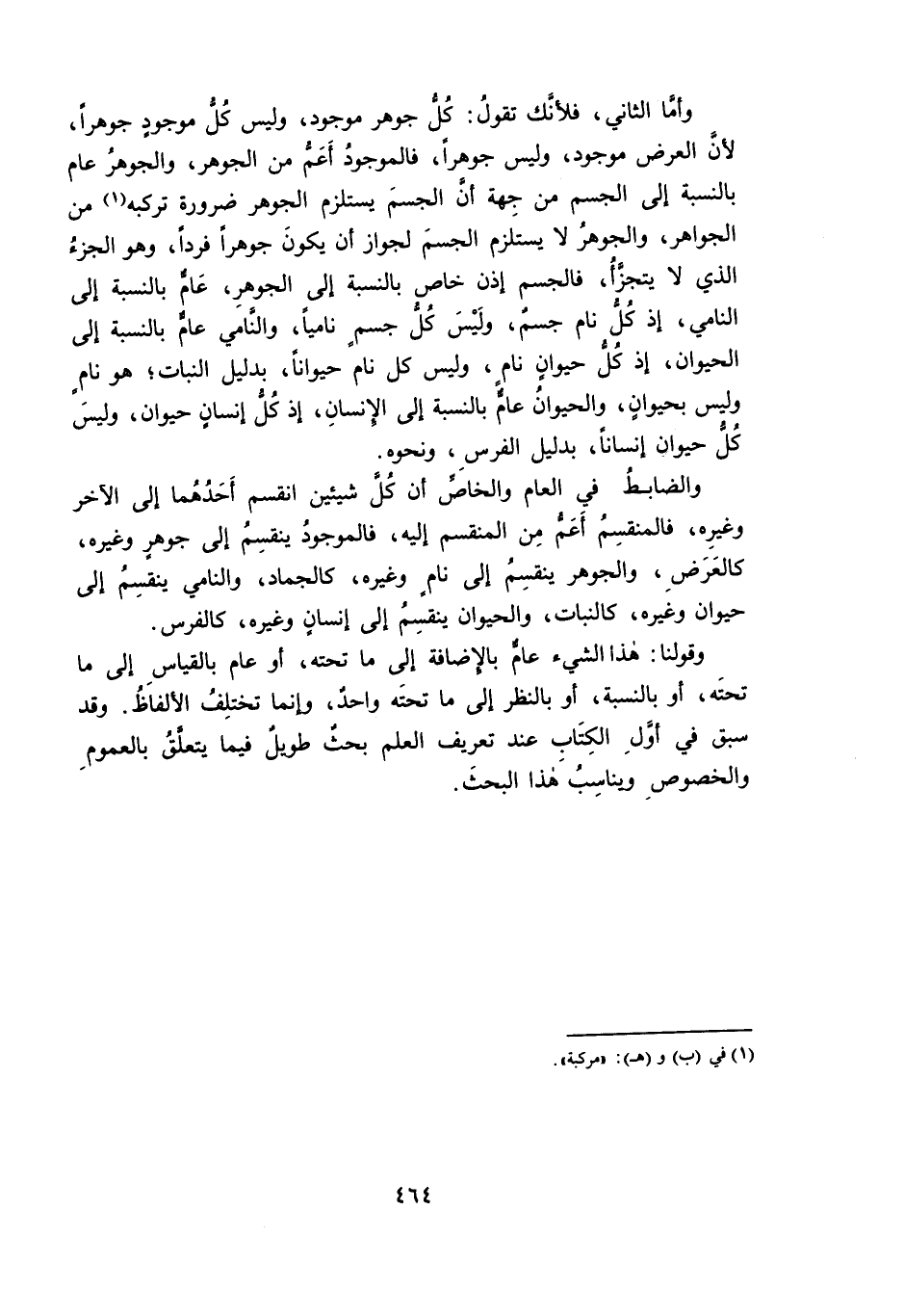وَأَمَّا الثَّانِي ; فَلِأَنَّكَ تَقُولُ: كُلُّ جَوْهَرٍ مَوْجُودٌ، وَلَيْسَ كُلُّ مَوْجُودٍ جَوْهَرًا ; لِأَنَّ الْعَرَضَ مَوْجُودٌ، وَلَيْسَ جَوْهَرًا ; فَالْمَوْجُودُ أَعَمُّ مِنَ الْجَوْهَرِ، وَالْجَوْهَرُ عَامٌّ بِالنِّسْبَةِ إِلَى الْجِسْمِ مِنْ جِهَةِ أَنَّ الْجِسْمَ يَسْتَلْزِمُ الْجَوْهَرَ ضَرُورَةَ تَرَكُّبِهِ مِنَ الْجَوَاهِرِ، وَالْجَوْهَرُ لَا يَسْتَلْزِمُ الْجِسْمَ لِجَوَازِ أَنْ يَكُونَ جَوْهَرًا فَرْدًا، وَهُوَ الْجُزْءُ الَّذِي لَا يَتَجَزَّأُ ; فَالْجِسْمُ إِذَنْ خَاصٌّ بِالنِّسْبَةِ إِلَى الْجَوْهَرِ، عَامٌّ بِالنِّسْبَةِ إِلَى النَّامِي، إِذْ كُلُّ نَامٍ جِسْمٌ، وَلَيْسَ كُلُّ جِسْمٍ نَامِيًا، وَالنَّامِي عَامٌّ بِالنِّسْبَةِ إِلَى الْحَيَوَانِ، إِذْ كُلُّ حَيَوَانٍ نَامٍ، وَلَيْسَ كُلُّ نَامٍ حَيَوَانًا، بِدَلِيلِ النَّبَاتِ، هُوَ نَامٍ وَلَيْسَ بِحَيَوَانٍ، وَالْحَيَوَانُ عَامٌّ بِالنِّسْبَةِ إِلَى الْإِنْسَانِ، إِذْ كُلُّ إِنْسَانٍ حَيَوَانٌ، وَلَيْسَ كُلُّ حَيَوَانٍ إِنْسَانًا، بِدَلِيلِ الْفَرَسِ، وَنَحْوِهِ.