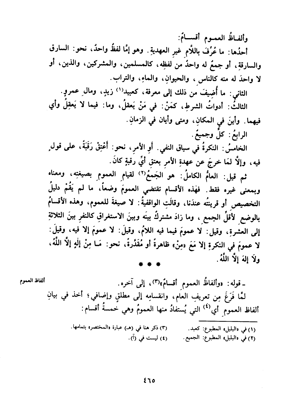 ثُمَّ قِيلَ: الْعَامُّ الْكَامِلُ: هُوَ الْجَمْعُ لِقِيَامُ الْعُمُومِ بِصِيغَتِهِ، وَمَعْنَاهُ وَبِمَعْنَى غَيْرِهِ فَقَطْ. فَهَذِهِ الْأَقْسَامُ تَقْتَضِي الْعُمُومَ وَضْعًا، مَا لَمْ يَقُمْ دَلِيلُ التَّخْصِيصِ أَوْ قَرِينَتُهُ عِنْدَنَا، وَقَالَتْ الْوَاقِفِيَّةُ: لَا صِيغَةَ لِلْعُمُومِ، وَهَذِهِ الْأَقْسَامُ بِالْوَضْعِ لِأَقَلِّ الْجَمْعِ، وَمَا زَادَ مُشْتَرِكٌ بَيْنَهُ وَبَيْنَ الِاسْتِغْرَاقِ كَالنَّفَرِ بَيْنَ الثَّلَاثَةِ إِلَى الْعَشَرَةِ، وَقِيلَ: لَا عُمُومَ فِيمَا فِيهِ اللَّامُ، وَقِيلَ: لَا عُمُومَ إِلَّا فِيهِ، وَقِيلَ: لَا عُمُومَ فِي النَّكِرَةِ إِلَّا مَعَ «مِنْ» ظَاهِرَةٍ أَوْ مُقَدَّرَةٍ، نَحْوَ: مَا مِنْ إِلَهٍ إِلَّا اللَّهُ، وَلَا إِلَهَ إِلَّا اللَّهُ.