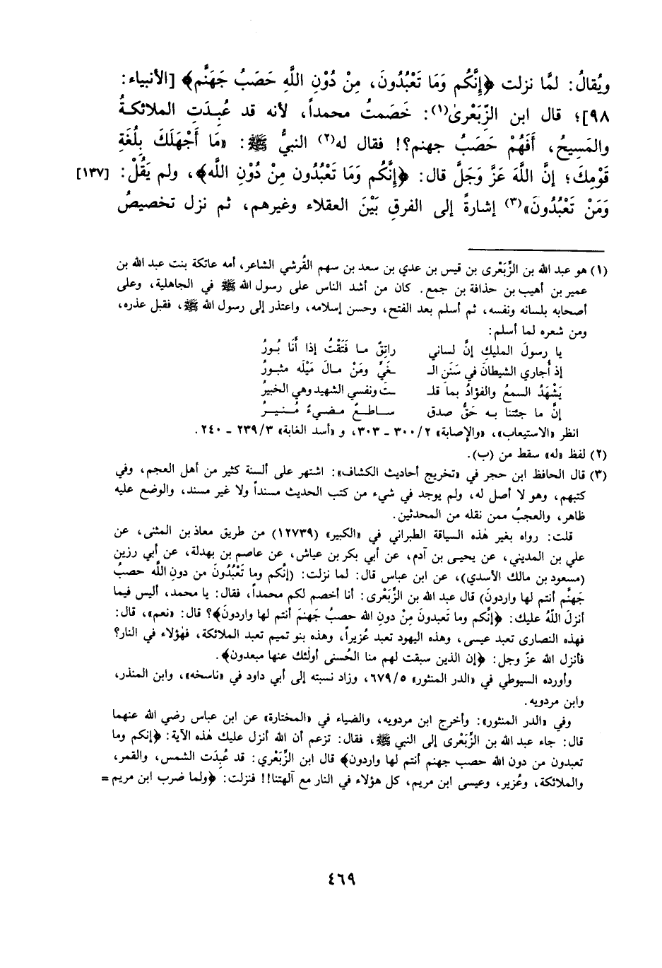 وَيُقَالُ: لَمَّا نَزَلَتْ: {إِنَّكُمْ وَمَا تَعْبُدُونَ مِنْ دُونِ اللَّهِ حَصَبُ جَهَنَّمَ} [الْأَنْبِيَاءِ: 98] ، قَالَ ابْنُ الزِّبَعْرَى: خَصَمْتُ مُحَمَّدًا ; لِأَنَّهُ قَدْ عُبِدَتِ الْمَلَائِكَةُ وَالْمَسِيحُ، أَفَهُمْ حَصَبُ جَهَنَّمَ؟ فَقَالَ لَهُ النَّبِيُّ صَلَّى اللَّهُ عَلَيْهِ وَسَلَّمَ: مَا أَجْهَلَكَ بِلُغَةِ قَوْمِكَ، إِنَّ اللَّهَ عَزَّ وَجَلَّ قَالَ: {إِنَّكُمْ وَمَا تَعْبُدُونَ مِنْ دُونِ اللَّهِ} ، وَلَمْ يَقُلْ: وَمَنْ تَعْبُدُونَ. إِشَارَةً إِلَى الْفَرْقِ بَيْنَ الْعُقَلَاءِ وَغَيْرِهِمْ، ثُمَّ نَزَلَ تَخْصِيصُ