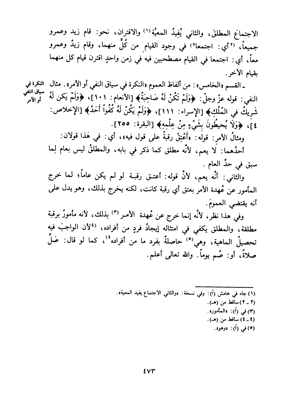 الْقِسْمُ «الْخَامِسُ» : مِنْ أَلْفَاظِ الْعُمُومِ «النَّكِرَةُ فِي سِيَاقِ النَّفْيِ أَوِ الْأَمْرِ» ، مِثَالُ النَّفْيِ: قَوْلُهُ عَزَّ وَجَلَّ: {وَلَمْ تَكُنْ لَهُ صَاحِبَةٌ} [الْأَنْعَامِ: 101] ، {وَلَمْ يَكُنْ لَهُ شَرِيكٌ فِي الْمُلْكِ} [الْإِسْرَاءِ: 111] ، {وَلَمْ يَكُنْ لَهُ كُفُوًا أَحَدٌ} [الْإِخْلَاصِ: 4] ، {وَلَا يُحِيطُونَ بِشَيْءٍ مِنْ عِلْمِهِ} [الْبَقَرَةِ: 255] .