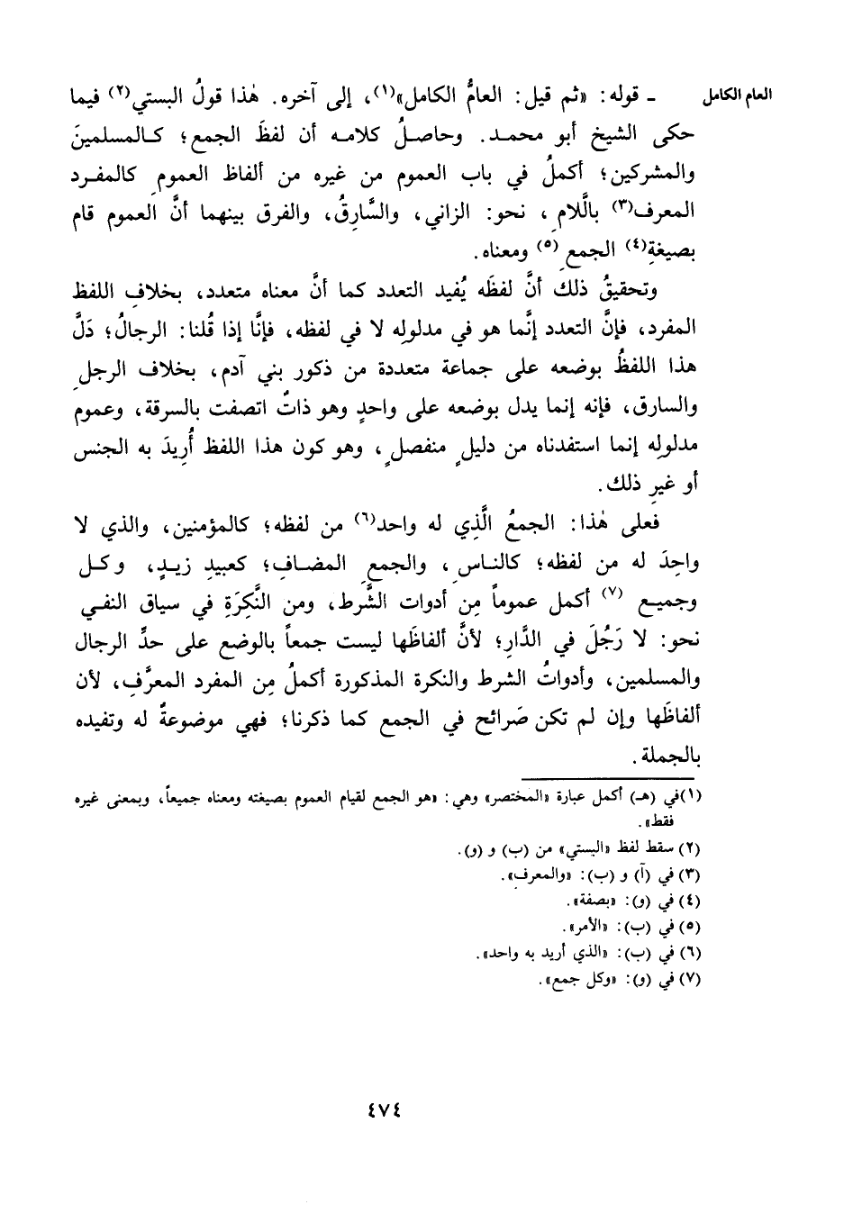 قَوْلُهُ: «ثُمَّ قِيلَ: الْعَامُّ الْكَامِلُ» ، إِلَى آخِرِهِ. هَذَا قَوْلُ الْبُسْتِيِّ فِيمَا حَكَى الشَّيْخُ أَبُو مُحَمَّدٍ. وَحَاصِلُ كَلَامِهِ أَنَّ لَفْظَ الْجَمْعِ ; كَالْمُسْلِمِينَ وَالْمُشْرِكِينَ، أَكْمَلُ فِي بَابِ الْعُمُومِ مِنْ غَيْرِهِ مِنْ أَلْفَاظِ الْعُمُومِ كَالْمُفْرَدِ الْمُعَرَّفِ بِاللَّامِ، نَحْوَ: الزَّانِي، وَالسَّارِقِ، وَالْفَرْقُ بَيْنَهُمَا أَنَّ الْعُمُومَ قَامَ بِصِيغَةِ الْجَمْعِ وَمَعْنَاهُ.