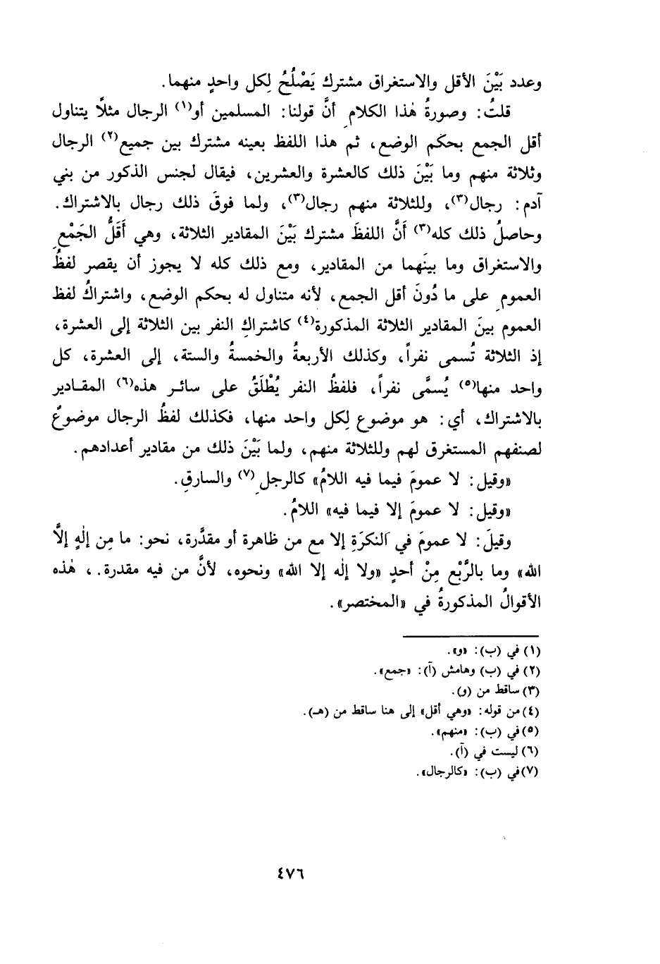 قُلْتُ: وَصُورَةُ هَذَا الْكَلَامِ أَنَّ قَوْلَنَا: الْمُسْلِمِينَ أَوِ الرِّجَالَ مَثَلًا يَتَنَاوَلُ أَقَلَّ الْجَمْعِ بِحُكْمِ الْوَضْعِ، ثُمَّ هَذَا اللَّفْظُ بِعَيْنِهِ مُشْتَرَكٌ بَيْنَ جَمِيعِ الرِّجَالِ وَثَلَاثَةٍ مِنْهُمْ وَمَا بَيْنَ ذَلِكَ كَالْعَشَرَةِ وَالْعِشْرِينَ ; فَيُقَالُ لِجِنْسِ الذُّكُورِ مِنْ بَنِي آدَمَ: رِجَالٌ، وَلِلثَّلَاثَةِ مِنْهُمْ رِجَالٌ، وَلِمَا فَوْقَ ذَلِكَ رِجَالٌ بِالِاشْتِرَاكِ. وَحَاصِلُ ذَلِكَ كُلِّهِ أَنَّ اللَّفْظَ مُشْتَرَكٌ بَيْنَ الْمَقَادِيرِ الثَّلَاثَةِ، وَهِيَ أَقَلُّ الْجَمْعِ وَالِاسْتِغْرَاقِ وَمَا بَيْنَهُمَا مِنَ الْمَقَادِيرِ، وَمَعَ ذَلِكَ كُلِّهِ لَا يَجُوزُ أَنْ يُقْصَرَ لَفْظُ الْعُمُومِ عَلَى مَا دُونِ أَقَلِّ الْجَمْعِ ; لِأَنَّهُ مُتَنَاوِلٌ لَهُ بِحُكْمِ الْوَضْعِ، وَاشْتِرَاكُ لَفْظِ الْعُمُومِ بَيْنَ الْمَقَادِيرِ الثَّلَاثَةِ الْمَذْكُورَةِ كَاشْتِرَاكِ النَّفَرِ بَيْنَ الثَّلَاثَةِ إِلَى الْعَشَرَةِ، إِذِ الثَّلَاثَةُ تُسَمَّى نَفَرًا، وَكَذَلِكَ الْأَرْبَعَةُ وَالْخَمْسَةُ وَالسِّتَّةُ، إِلَى الْعَشَرَةِ، كُلُّ وَاحِدٍ مِنْهَا يُسَمَّى نَفَرًا ; فَلَفْظُ النَّفَرِ يُطْلَقُ عَلَى سَائِرِ هَذِهِ الْمَقَادِيرِ بِالِاشْتِرَاكِ، أَيْ: هُوَ مَوْضُوعٌ لِكُلِّ وَاحِدٍ مِنْهَا ; فَكَذَلِكَ لَفَظُ الرِّجَالِ مَوْضُوعٌ لِصِنْفِهِمُ الْمُسْتَغْرِقِ لَهُمْ وَلِلثَّلَاثَةِ مِنْهُمْ، وَلِمَا بَيْنَ ذَلِكَ مِنْ مَقَادِيرِ أَعْدَادِهِمْ.