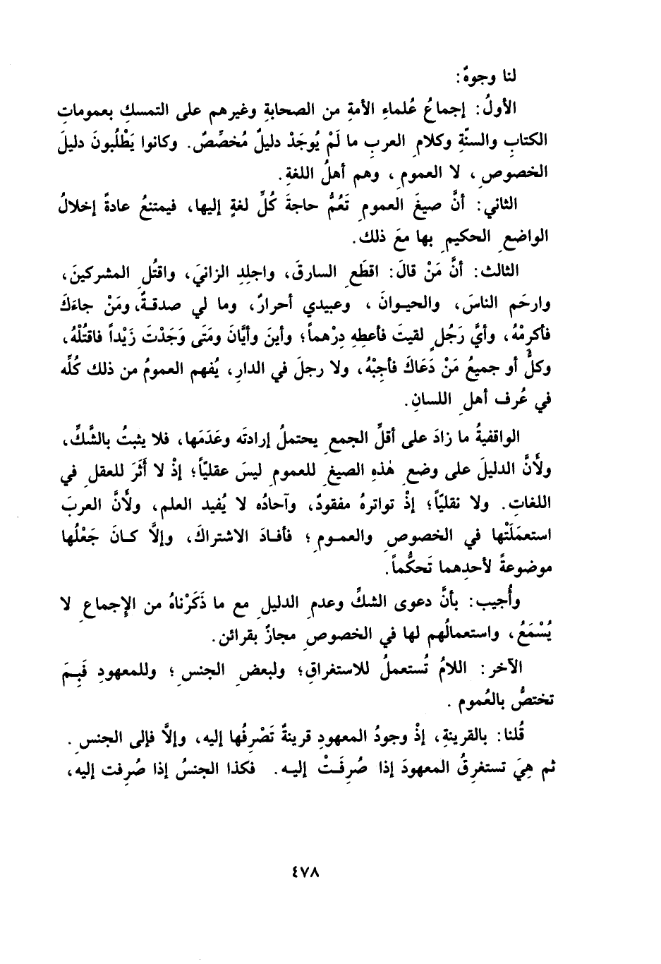 الْأَوَّلَ: إِجْمَاعُ عُلَمَاءِ الْأُمَّةِ مِنَ الصَّحَابَةِ وَغَيْرِهِمْ عَلَى التَّمَسُّكِ بِعُمُومَاتِ الْكِتَابِ وَالسُّنَّةِ وَكَلَامِ الْعَرَبِ مَا لَمْ يُوجَدْ دَلِيلٌ مُخَصِّصٌ. وَكَانُوا يَطْلُبُونَ دَلِيلَ الْخُصُوصِ، لَا الْعُمُومِ، وَهُمْ أَهْلُ اللُّغَةِ.