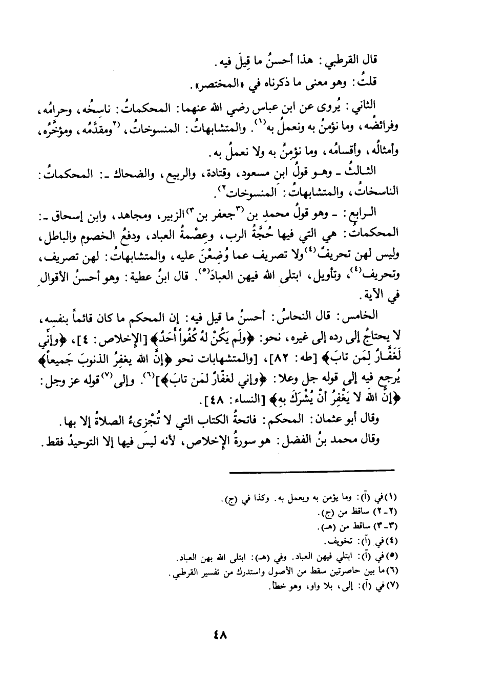 الْخَامِسُ: قَالَ النُّحَاسُ: أَحْسَنُ مَا قِيلَ فِيهِ: إِنَّ الْمُحْكَمَ مَا كَانَ قَائِمًا بِنَفْسِهِ، لَا يَحْتَاجُ إِلَى رَدِّهِ إِلَى غَيْرِهِ، نَحْوَ {وَلَمْ يَكُنْ لَهُ كُفُوًا أَحَدٌ} [الْإِخْلَاصِ: 4] ، {وَإِنِّي لَغَفَّارٌ لِمَنْ تَابَ} [طه: 82] ، وَالْمُتَشَابِهَاتُ نَحْوَ {إِنَّ اللَّهَ يَغْفِرُ الذُّنُوبَ جَمِيعًا} ، يَرْجِعُ فِيهِ إِلَى قَوْلِهِ جَلَّ وَعَلَا: {وَإِنِّي لَغَفَّارٌ لِمَنْ تَابَ} وَإِلَى قَوْلِهِ عَزَّ وَجَلَّ: {إِنَّ اللَّهَ لَا يَغْفِرُ أَنْ يُشْرَكَ بِهِ} [النِّسَاءِ: 48] .