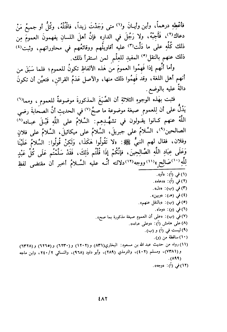 فَثَبَتَ بِهَذِهِ الْوُجُوهِ الثَّلَاثَةِ أَنَّ الصِّيَغَ الْمَذْكُورَةَ مَوْضُوعَةٌ لِلْعُمُومِ، وَمِمَّا يَدُلُّ عَلَى أَنَّ لِلْعُمُومِ صِيغَةً مَوْضُوعَةً مَا صَحَّ فِي الْحَدِيثِ أَنَّ الصَّحَابَةَ رَضِيَ اللَّهُ عَنْهُمْ كَانُوا يَقُولُونَ فِي تَشَهُّدِهِمْ: السَّلَامُ عَلَى اللَّهِ قَبْلَ عِبَادِهِ الصَّالِحِينَ، السَّلَامُ عَلَى جِبْرِيلَ، السَّلَامُ عَلَى مِيكَائِيلَ، السَّلَامُ عَلَى فُلَانٍ، وَفُلَانٍ ; فَقَالَ لَهُمُ النَّبِيُّ صَلَّى اللَّهُ عَلَيْهِ وَسَلَّمَ: لَا تَقُولُوا هَكَذَا، وَلَكِنْ قُولُوا: السَّلَامُ عَلَيْنَا وَعَلَى عِبَادِ اللَّهِ الصَّالِحِينَ ; فَإِنَّكُمْ إِذَا قُلْتُمْ ذَلِكَ ; فَقَدْ سَلَّمْتُمْ عَلَى كُلِّ عَبْدٍ لِلَّهِ صَالِحٍ. وَوَجْهُ دَلَالَتِهِ أَنَّهُ عَلَيْهِ السَّلَامُ أَخْبَرَ أَنَّ مُقْتَضَى لَفْظِ