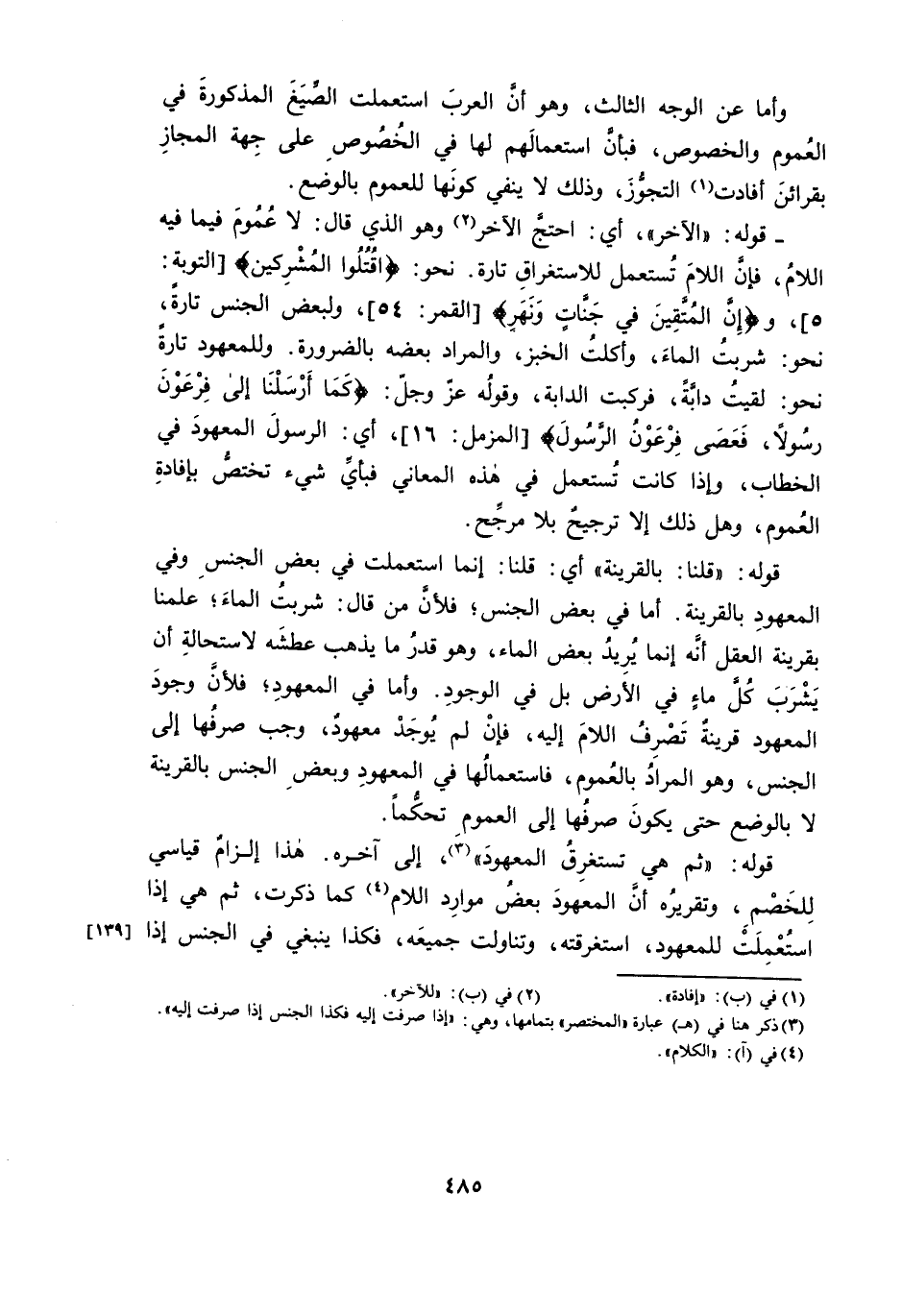 قَوْلُهُ: «الْآخَرُ» ، أَيِ: احْتَجَّ الْآخَرُ وَهُوَ الَّذِي قَالَ: لَا عُمُومَ فِيمَا فِيهِ اللَّامُ، فَإِنَّ اللَّامَ تُسْتَعْمَلُ لِلِاسْتِغْرَاقِ تَارَةً. نَحْوَ: {فَاقْتُلُوا الْمُشْرِكِينَ} [التَّوْبَةِ: 5] ، {إِنَّ الْمُتَّقِينَ فِي جَنَّاتٍ وَنَهَرٍ} [الْقَمَرِ: 54] ، وَلِبَعْضِ الْجِنْسِ تَارَةً، نَحْوَ: شَرِبْتُ الْمَاءَ، وَأَكَلْتُ الْخُبْزَ، وَالْمُرَادُ بَعْضُهُ بِالضَّرُورَةِ. وَلِلْمَعْهُودِ تَارَةً نَحْوَ: لَقِيتُ الدَّابَّةَ ; فَرَكِبْتُ الدَّابَّةَ، وَقَوْلِهِ عَزَّ وَجَلَّ: {كَمَا أَرْسَلْنَا إِلَى فِرْعَوْنَ رَسُولًا} {فَعَصَى فِرْعَوْنُ الرَّسُولَ} [الْمُزَّمِّلِ: 16] ، أَيِ: الرَّسُولَ الْمَعْهُودَ فِي الْخِطَابِ، وَإِذَا كَانَتْ تُسْتَعْمَلُ فِي هَذِهِ الْمَعَانِي فَبِأَيِّ شَيْءٍ تَخْتَصُّ بِإِفَادَةِ الْعُمُومِ، وَهَلْ ذَلِكَ إِلَّا تَرْجِيحٌ بِلَا مُرَجِّحٍ.