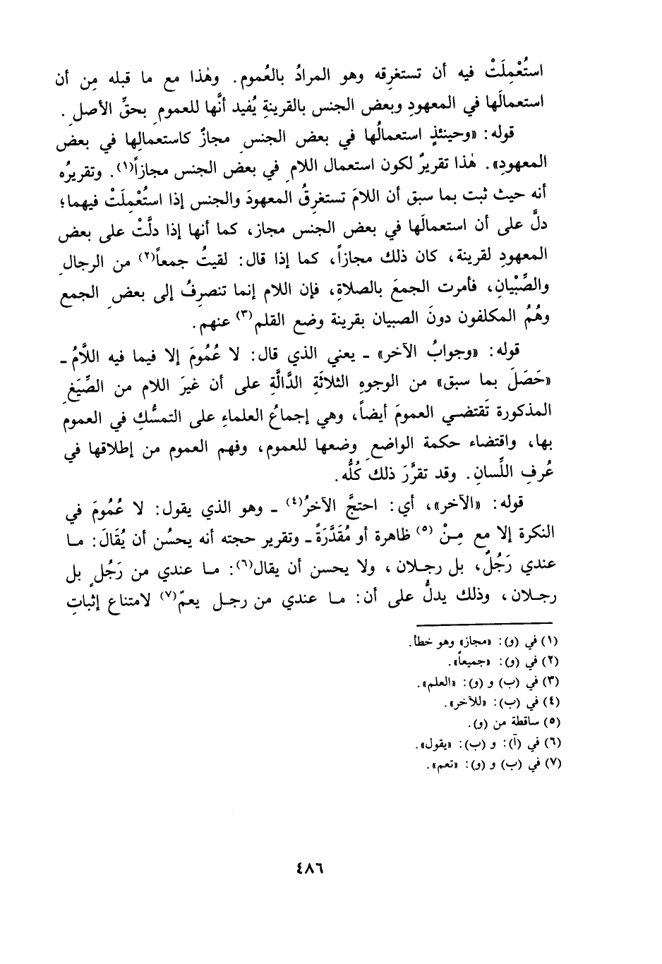 قَوْلُهُ: «وَحِينَئِذٍ اسْتِعْمَالُهَا فِي بَعْضِ الْجِنْسِ مَجَازٌ كَاسْتِعْمَالِهَا فِي بَعْضِ الْمَعْهُودِ» . هَذَا تَقْرِيرٌ لِكَوْنِ اسْتِعْمَالِ اللَّامِ فِي بَعْضِ الْجِنْسِ مَجَازًا. وَتَقْرِيرُهُ أَنَّهُ حَيْثُ ثَبَتَ بِمَا سَبَقَ أَنَّ اللَّامَ تَسْتَغْرِقُ الْمَعْهُودَ وَالْجِنْسَ إِذَا اسْتُعْمِلَتْ فِيهِمَا، دَلَّ عَلَى أَنَّ اسْتِعْمَالَهَا فِي بَعْضِ الْجِنْسِ مُجَازٌ، كَمَا أَنَّهَا إِذَا دَلَّتْ عَلَى بَعْضِ الْمَعْهُودِ لِقَرِينَةٍ، كَانَ ذَلِكَ مَجَازًا، كَمَا إِذَا قَالَ: لَقِيتُ جَمْعًا مِنَ الرِّجَالِ وَالصِّبْيَانِ ; فَأَمَرْتُ الْجَمْعَ بِالصَّلَاةِ، فَإِنَّ اللَّامَ إِنَّمَا تَنْصَرِفُ إِلَى بَعْضِ الْجَمْعِ وَهُمُ الْمُكَلَّفُونَ دُونَ الصِّبْيَانِ بِقَرِينَةِ وَضْعِ الْقَلَمِ عَنْهُمْ.