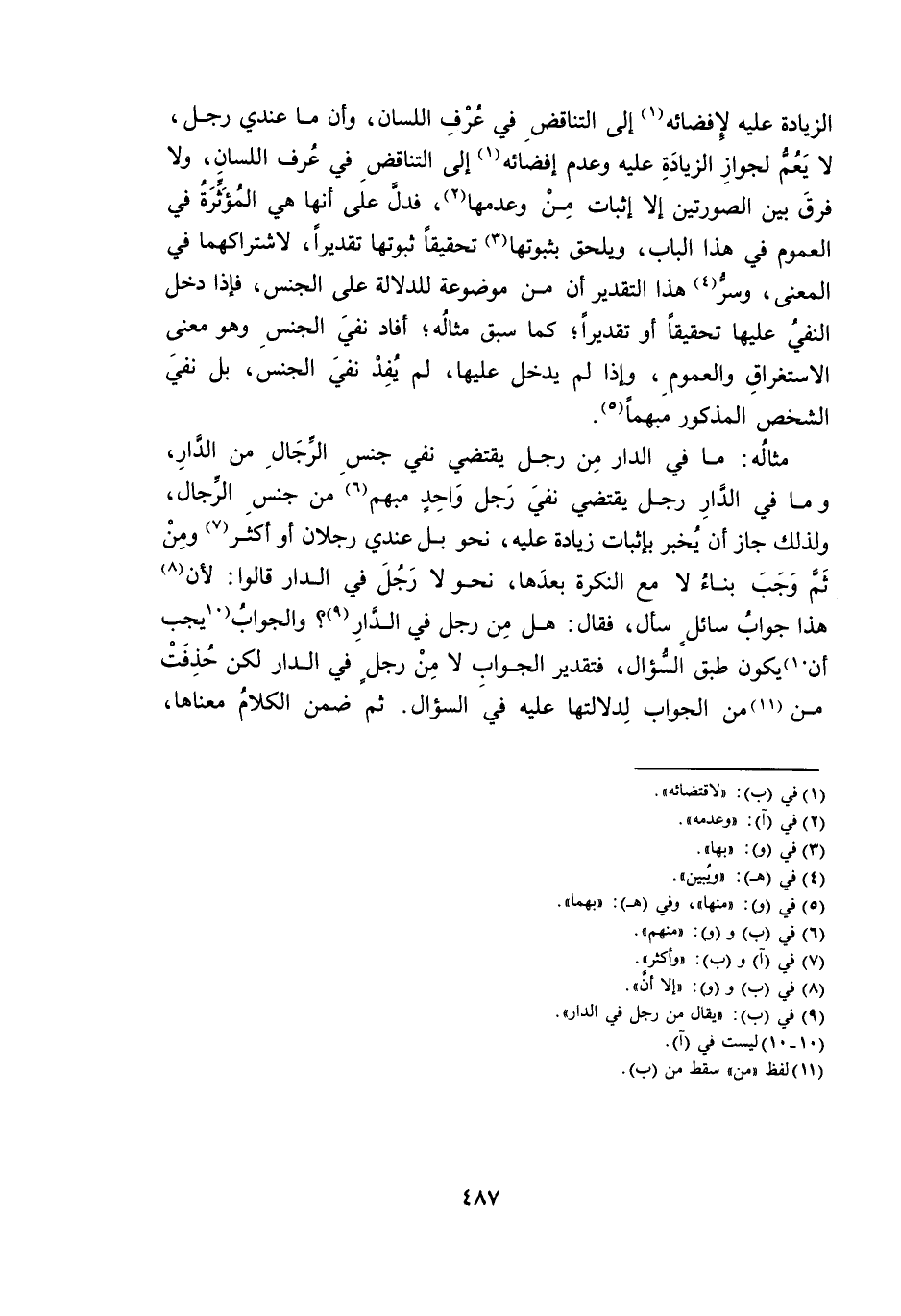 مِثَالُهُ: مَا فِي الدَّارِ مِنْ رَجُلٍ، يَقْتَضِي نَفْيَ جِنْسِ الرِّجَالِ مِنَ الدَّارِ، وَمَا فِي الدَّارِ رَجُلٌ، يَقْتَضِي نَفْيَ رَجُلٍ وَاحِدٍ مُبْهَمٍ مِنْ جِنْسِ الرِّجَالِ، وَلِذَلِكَ جَازَ أَنْ يُخْبَرَ بِإِثْبَاتِ زِيَادَةٍ عَلَيْهِ، نَحْوَ بَلْ عِنْدِي رَجُلَانِ أَوْ أَكْثَرُ، وَمِنْ ثَمَّ وَجَبَ بِنَاءُ لَا مَعَ النَّكِرَةِ بَعْدَهَا، نَحْوَ لَا رَجُلَ فِي الدَّارِ، قَالُوا: لِأَنَّ هَذَا جَوَابُ سَائِلٍ سَأَلَ ; فَقَالَ: هَلْ مِنْ رَجُلٍ فِي الدَّارِ؟ وَالْجَوَابُ يَجِبُ أَنْ يَكُونَ طِبْقَ السُّؤَالِ ; فَتَقْدِيرُ الْجَوَابِ لَا مِنْ رَجُلٍ فِي الدَّارِ لَكِنْ حُذِفَتْ «مِنْ» مِنَ الْجَوَابِ لِدَلَالَتِهَا عَلَيْهِ فِي السُّؤَالِ. ثُمَّ ضُمِّنَ الْكَلَامُ مَعْنَاهَا،