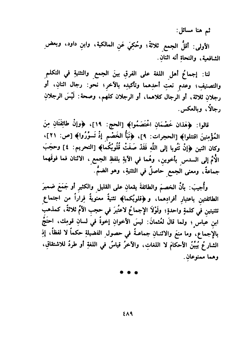 قَالُوا: {هَذَانِ خَصْمَانِ اخْتَصَمُوا} [الْحَجِّ: 19] ، {وَإِنْ طَائِفَتَانِ مِنَ الْمُؤْمِنِينَ اقْتَتَلُوا} [الْحُجُرَاتِ: 9] ، {نَبَأُ الْخَصْمِ إِذْ تَسَوَّرُوا} [ص: 21] ، وَكَانَ اثْنَيْنِ {إِنْ تَتُوبَا إِلَى اللَّهِ فَقَدْ صَغَتْ قُلُوبُكُمَا} [التَّحْرِيمِ: 4] وَحَجَبَ الْأُمَّ إِلَى السُّدُسِ بِأَخَوَيْنِ، وَهُمَا فِي الْآيَةِ بِلَفْظِ الْجَمْعِ، الِاثْنَانِ فَمَا فَوْقَهُمَا جَمَاعَةٌ، وَمَعْنَى الْجَمْعِ حَاصِلٌ فِي التَّثْنِيَةِ، وَهُوَ الضَّمُّ.