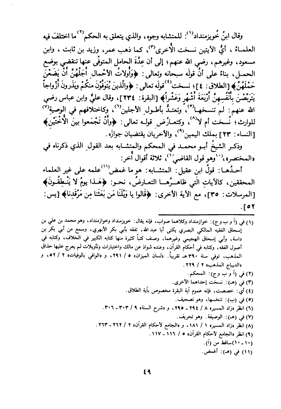 وَقَالَ ابْنُ خُوَيْزَمَنْدَادُ: لِلْمُتَشَابِهِ وُجُوهٌ، وَالَّذِي يَتَعَلَّقُ بِهِ الْحُكْمُ مَا اخْتَلَفَ فِيهِ الْعُلَمَاءُ، أَيُّ الْآيَتَيْنِ نَسَخَتِ الْأُخْرَى، كَمَا ذَهَبَ عُمَرُ، وَزَيْدُ بْنُ ثَابِتٍ، وَابْنُ مَسْعُودٍ، وَغَيْرُهُمْ، رَضِيَ اللَّهُ عَنْهُمْ ; إِلَى أَنَّ عِدَّةِ الْحَامِلِ الْمُتَوَفَّى عَنْهَا تَنْقَضِي بِوَضْعِ الْحَمْلِ، بِنَاءً عَلَى أَنَّ قَوْلَهُ سُبْحَانَهُ وَتَعَالَى: {وَأُولَاتُ الْأَحْمَالِ أَجَلُهُنَّ أَنْ يَضَعْنَ حَمْلَهُنَّ} [الطَّلَاقِ: 4] ; نَسَخَتْ قَوْلَهُ تَعَالَى: {وَالَّذِينَ يُتَوَفَّوْنَ مِنْكُمْ وَيَذَرُونَ أَزْوَاجًا يَتَرَبَّصْنَ بِأَنْفُسِهِنَّ أَرْبَعَةَ أَشْهُرٍ وَعَشْرًا} [الْبَقَرَةِ: 234] ، وَقَالَ عَلِيٌّ وَابْنُ عَبَّاسٍ، رَضِيَ اللَّهُ عَنْهُمْ: لَمْ تَنْسَخْهَا، وَتَعْتَدُ بِأَطْوَلِ الْأَجَلَيْنِ، وَكَاخْتِلَافِهِمْ فِي الْوَصِيَّةِ لِلْوَارِثِ ; نُسِخَتْ أَمْ لَا، وَكَتَعَارُضِ قَوْلِهِ تَعَالَى: {وَأَنْ تَجْمَعُوا بَيْنَ الْأُخْتَيْنِ} [النِّسَاءِ: 23] بِمِلْكِ الْيَمِينِ، وَالْأُخْرَيَانِ يَقْتَضِيَانِ جَوَازَهُ.