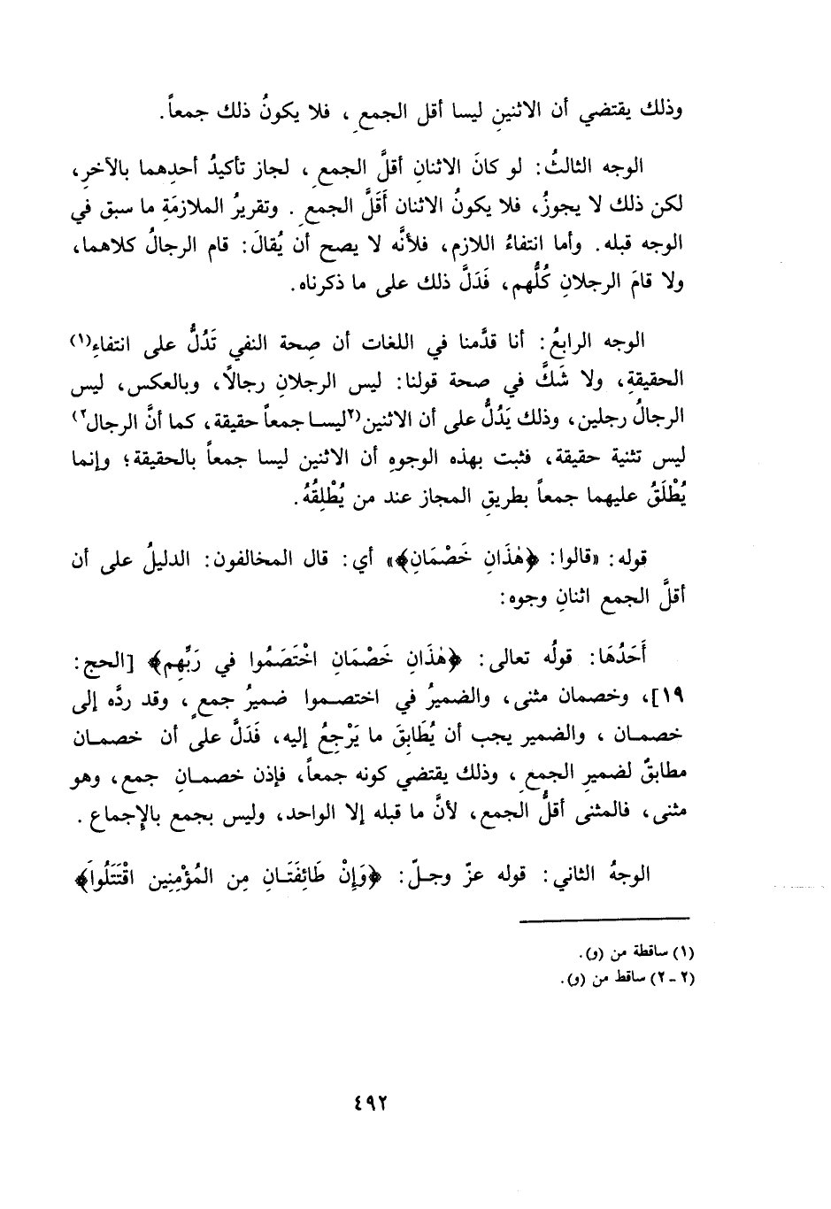 أَحَدُهَا: قَوْلُهُ تَعَالَى: {هَذَانِ خَصْمَانِ اخْتَصَمُوا فِي رَبِّهِمْ} [الْحَجِّ: 19] ، وَخَصْمَانِ مُثَنًّى، وَالضَّمِيرُ فِي اخْتَصَمُوا ضَمِيرُ جَمْعٍ، وَقَدْ رَدَّهُ إِلَى خَصْمَانِ، وَالضَّمِيرُ يَجِبُ أَنْ يُطَابِقَ مَا يَرْجِعُ إِلَيْهِ ; فَدَلَّ عَلَى أَنَّ خَصْمَانِ مُطَابِقٌ لِضَمِيرِ الْجَمْعِ، وَذَلِكَ يَقْتَضِي كَوْنَهُ جَمْعًا ; فَإِذَنْ خَصْمَانِ جَمْعٌ، وَهُوَ مُثَنًّى ; فَالْمُثَنَّى أَقَلُّ الْجَمْعِ ; لِأَنَّ مَا قَبْلَهُ إِلَّا الْوَاحِدُ، وَلَيْسَ بِجَمْعٍ بِالْإِجْمَاعِ.