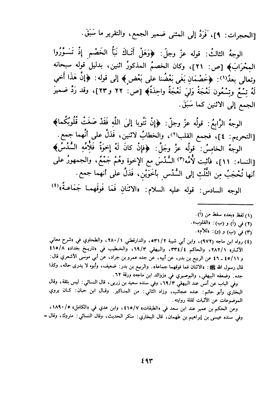 الْوَجْهُ الرَّابِعُ: قَوْلُهُ عَزَّ وَجَلَّ: {إِنْ تَتُوبَا إِلَى اللَّهِ فَقَدْ صَغَتْ قُلُوبُكُمَا} [التَّحْرِيمِ: 4] ; فَجَمَعَ الْقَلْبَ، وَالْخِطَابُ لِاثْنَيْنِ ; فَدَلَّ عَلَى أَنَّهُمَا جَمْعٌ.