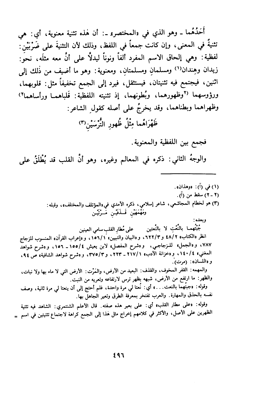 أَحَدُهُمَا - وَهُوَ الَّذِي فِي «الْمُخْتَصَرِ» -: أَنَّ هَذِهِ تَثْنِيَةٌ مَعْنَوِيَّةٌ، أَيْ: هِيَ تَثْنِيَةٌ فِي الْمَعْنَى، وَإِنْ كَانَتْ جَمْعًا فِي اللَّفْظِ، وَذَلِكَ لِأَنَّ التَّثْنِيَةَ عَلَى ضَرْبَيْنِ: لَفْظِيَّةٌ: وَهِيَ إِلْحَاقُ الِاسْمِ الْمُفْرَدِ أَلِفًا وَنُونًا لِيَدُلَّا عَلَى أَنَّ مَعَهُ مِثْلَهُ، نَحْوَ: زَيْدَانِ وَهِنْدَانِ وَمُسْلِمَانِ وَمُسْلِمَتَانِ، وَمَعْنَوِيَّةٌ: وَهُوَ مَا أُضِيفَ مِنْ ذَلِكَ إِلَى اثْنَيْنِ ; فَيَجْتَمِعُ فِيهِ تَثْنِيَتَانِ ; فَيُسْتَثْقَلُ ; فَيُرَدُّ إِلَى الْجَمْعِ تَخْفِيفًا مِثْلُ: قُلُوبِهِمَا، وَرُؤُوسِهِمَا وَظُهُورِهِمَا، وَبُطُونِهِمَا، إِذْ تَثْنِيَتُهُ اللَّفْظِيَّةُ: قَلْبَاهُمَا وَرَأْسَاهُمَا، وَظَهْرَاهُمَا وَبَطْنَاهُمَا، وَقَدْ يَخْرُجُ عَلَى أَصْلِهِ كَقَوْلِ الشَّاعِرِ: