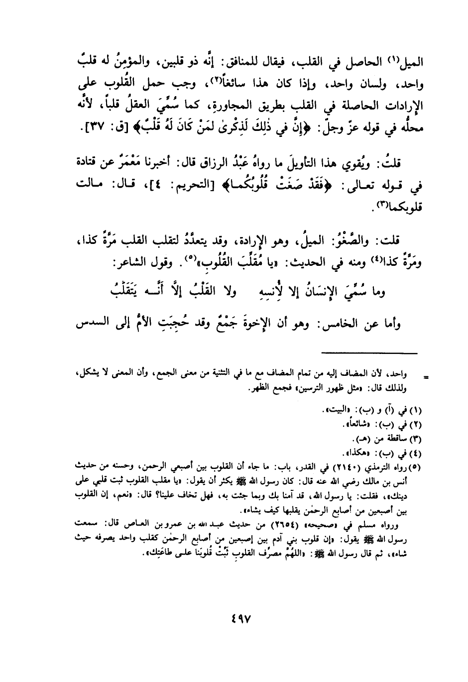 الْمَيْلِ الْحَاصِلِ فِي الْقَلْبِ ; فَيُقَالُ لِلْمُنَافِقِ: إِنَّهُ ذُو قَلْبَيْنِ، وَالْمُؤْمِنُ لَهُ قَلْبٌ وَاحِدٌ، وَلِسَانٌ وَاحِدٌ، وَإِذَا كَانَ هَذَا سَائِغًا، وَجَبَ حَمْلُ الْقُلُوبِ عَلَى الْإِرَادَاتِ الْحَاصِلَةِ فِي الْقَلْبِ بِطَرِيقِ الْمُجَاوَرَةِ، كَمَا سُمِّيَ الْعَقْلُ قَلْبًا ; لِأَنَّهُ مَحَلُّهُ فِي قَوْلِهِ عَزَّ وَجَلَّ: {إِنَّ فِي ذَلِكَ لَذِكْرَى لِمَنْ كَانَ لَهُ قَلْبٌ} [ق: 37] .