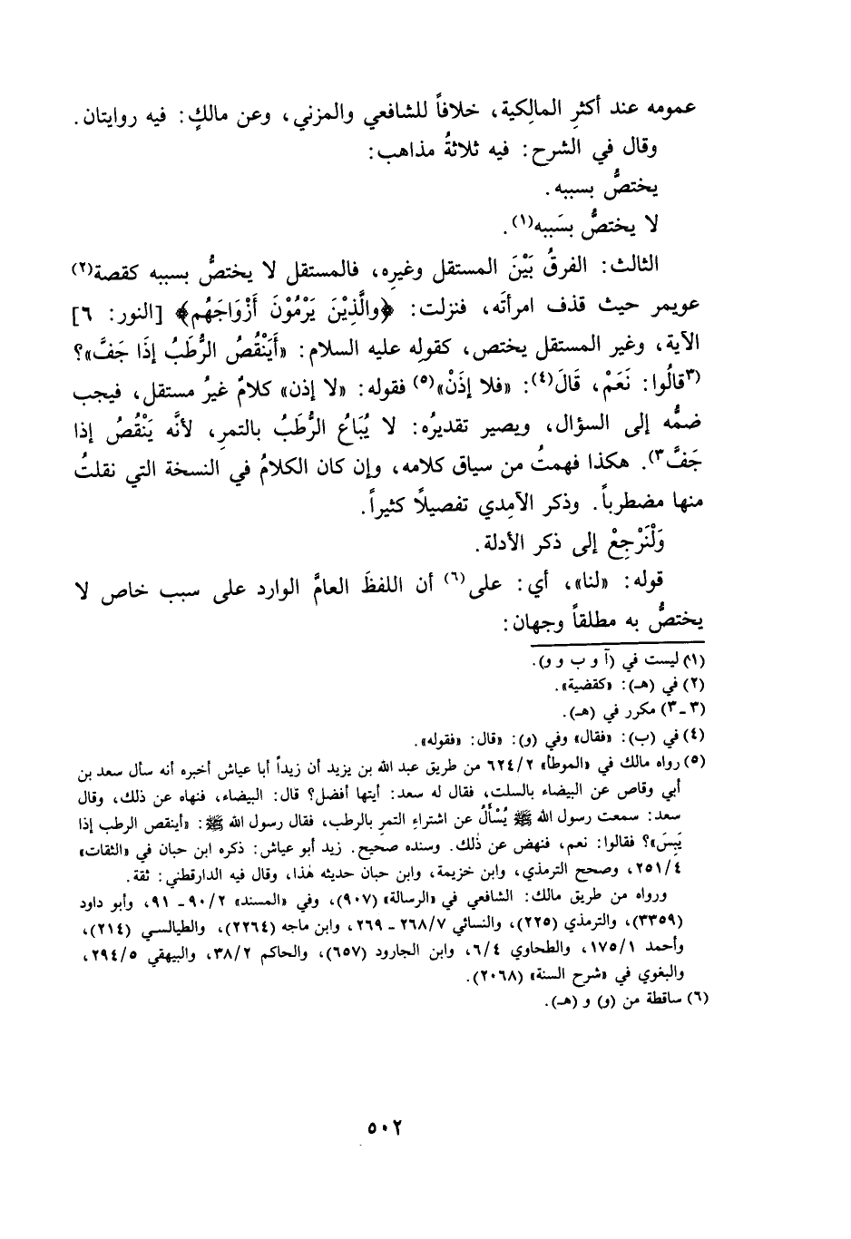 عُمُومِهِ عِنْدَ أَكْثَرِ الْمَالِكِيَّةِ، خِلَافًا لِلشَّافِعِيِّ وَالْمُزَنِيِّ، وَعَنْ مَالِكٍ: فِيهِ رِوَايَتَانِ.