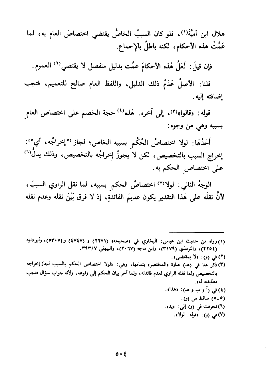 هِلَالِ بْنِ أُمَيَّةَ» ; فَلَوْ كَانَ السَّبَبُ الْخَاصُّ يَقْتَضِي اخْتِصَاصَ الْعَامِّ بِهِ، لَمَا عَمَّتْ هَذِهِ الْأَحْكَامُ، لَكِنَّهُ بَاطِلٌ بِالْإِجْمَاعِ.