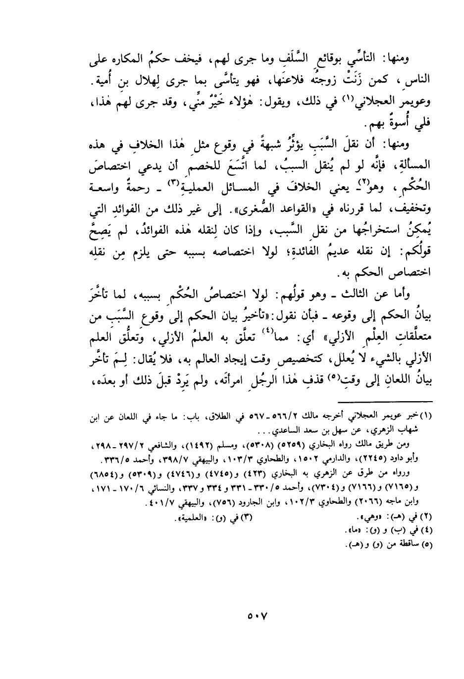 وَمِنْهَا: أَنَّ نَقْلَ السَّبَبِ يُؤَثِّرُ شُبْهَةً فِي وُقُوعِ مِثْلِ هَذَا الْخِلَافِ فِي هَذِهِ الْمَسْأَلَةِ ; فَإِنَّهُ لَوْ لَمْ يُنْقَلِ السَّبَبُ، لَمَا اتَّسَعَ لِلْخَصْمِ أَنْ يَدَّعِيَ اخْتِصَاصَ الْحُكْمِ، وَهُوَ، يَعْنِي الْخِلَافَ فِي الْمَسَائِلِ الْعَمَلِيَّةِ، رَحْمَةٌ وَاسِعَةٌ وَتَخْفِيفٌ، لِمَا قَرَّرْنَاهُ فِي الْقَوَاعِدِ الصُّغْرَى. إِلَى غَيْرِ ذَلِكَ مِنَ الْفَوَائِدِ الَّتِي يُمْكِنُ اسْتِخْرَاجُهَا مِنْ نَقْلِ السَّبَبِ، وَإِذَا كَانَ لِنَقْلِهِ هَذِهِ الْفَوَائِدُ، لَمْ يَصِحَّ قَوْلُكُمْ: إِنَّ نَقْلَهُ عَدِيمُ الْفَائِدَةِ، لَوْلَا اخْتِصَاصُهُ بِسَبَبِهِ حَتَّى يَلْزَمَ مِنْ نَقْلِهِ اخْتِصَاصُ الْحُكْمِ بِهِ.