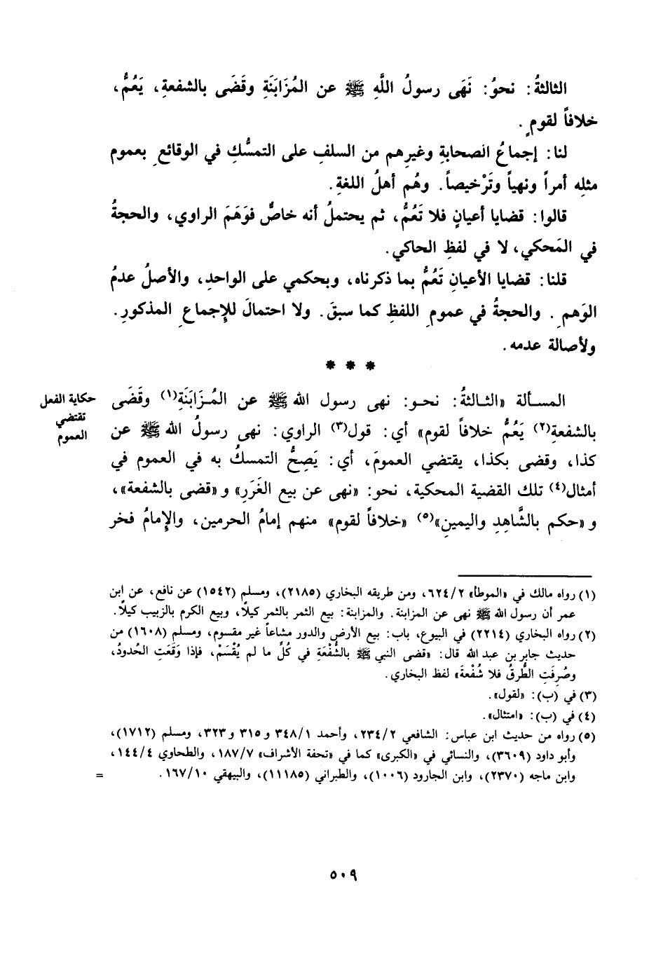 الْمَسْأَلَةُ «الثَّالِثَةُ: نَحْوُ: نَهَى رَسُولُ اللَّهِ صَلَّى اللَّهُ عَلَيْهِ وَسَلَّمَ، عَنْ الْمُزَابَنَةِ وَقَضَى بِالشُّفْعَةِ يَعُمُّ خِلَافًا لِقَوْمٍ» ، أَيْ: قَوْلُ الرَّاوِي: نَهَى رَسُولُ اللَّهِ صَلَّى اللَّهُ عَلَيْهِ وَسَلَّمَ، عَنْ كَذَا، وَقَضَى بِكَذَا، يَقْتَضِي الْعُمُومَ، أَيْ: يَصِحُّ التَّمَسُّكُ بِهِ فِي الْعُمُومِ فِي أَمْثَالِ تِلْكَ الْقَضِيَّةِ الْمَحْكِيَّةِ، نَحْوُ: نَهَى عَنْ بَيْعِ الْغَرَرِ، وَقَضَى بِالشُّفْعَةِ، وَحَكَمَ بِالشَّاهِدِ وَالْيَمِينِ، خِلَافًا لِقَوْمٍ مِنْهُمْ إِمَامُ الْحَرَمَيْنِ، وَالْإِمَامُ فَخْرُ