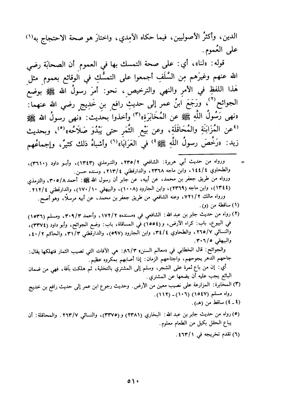 قَوْلُهُ: «لَنَا» ، أَيْ: عَلَى صِحَّةِ التَّمَسُّكِ بِهَا فِي الْعُمُومِ أَنَّ الصَّحَابَةَ رَضِيَ اللَّهُ عَنْهُمْ وَغَيْرَهُمْ مِنَ السَّلَفِ أَجْمَعُوا عَلَى التَّمَسُّكِ فِي الْوَقَائِعِ بِعُمُومِ مِثْلِ هَذَا اللَّفْظِ فِي الْأَمْرِ وَالنَّهْيِ وَالتَّرْخِيصِ، نَحْوُ: أَمَرَ رَسُولُ اللَّهِ صَلَّى اللَّهُ عَلَيْهِ وَسَلَّمَ، بِوَضْعِ الْجَوَائِحِ، وَرَجَعَ ابْنُ عُمَرَ إِلَى حَدِيثِ رَافِعِ بْنِ خَدِيجٍ رَضِيَ اللَّهُ عَنْهُمَا: نَهَى رَسُولُ اللَّهِ صَلَّى اللَّهُ عَلَيْهِ وَسَلَّمَ، عَنِ الْمُخَابَرَةِ، وَأَخَذُوا بِحَدِيثِ نَهَى رَسُولُ اللَّهِ صَلَّى اللَّهُ عَلَيْهِ وَسَلَّمَ، عَنِ الْمُزَابَنَةِ وَالْمُحَاقَلَةِ، وَعَنْ بَيْعِ الثَّمَرِ حَتَّى يَبْدُوَ صَلَاحُهُ. وَبِحَدِيثِ زَيْدٍ: رَخَّصَ رَسُولُ اللَّهِ صَلَّى اللَّهُ عَلَيْهِ وَسَلَّمَ، فِي الْعَرَايَا. وَأَشْبَاهُ ذَلِكَ كَثِيرٌ، وَإِجْمَاعُهُمْ